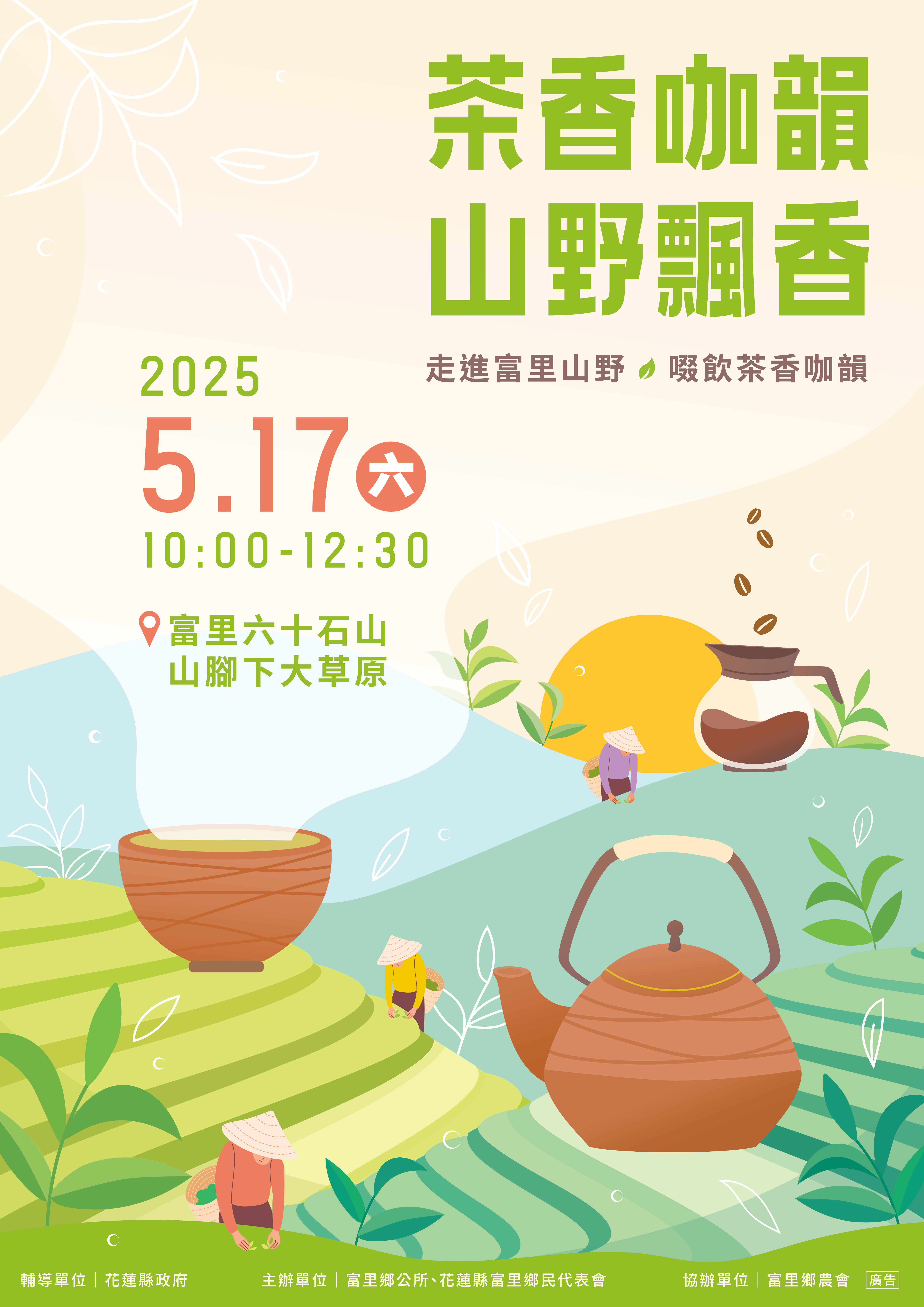 富里鄉公所將於本(2025)年5月17日舉辦「茶香咖韻-山野飄香」活動,誠摯邀請鄉親及各地民眾踴躍參與,體驗在山野間啜飲在地茶香與咖啡香的悠閒時光。