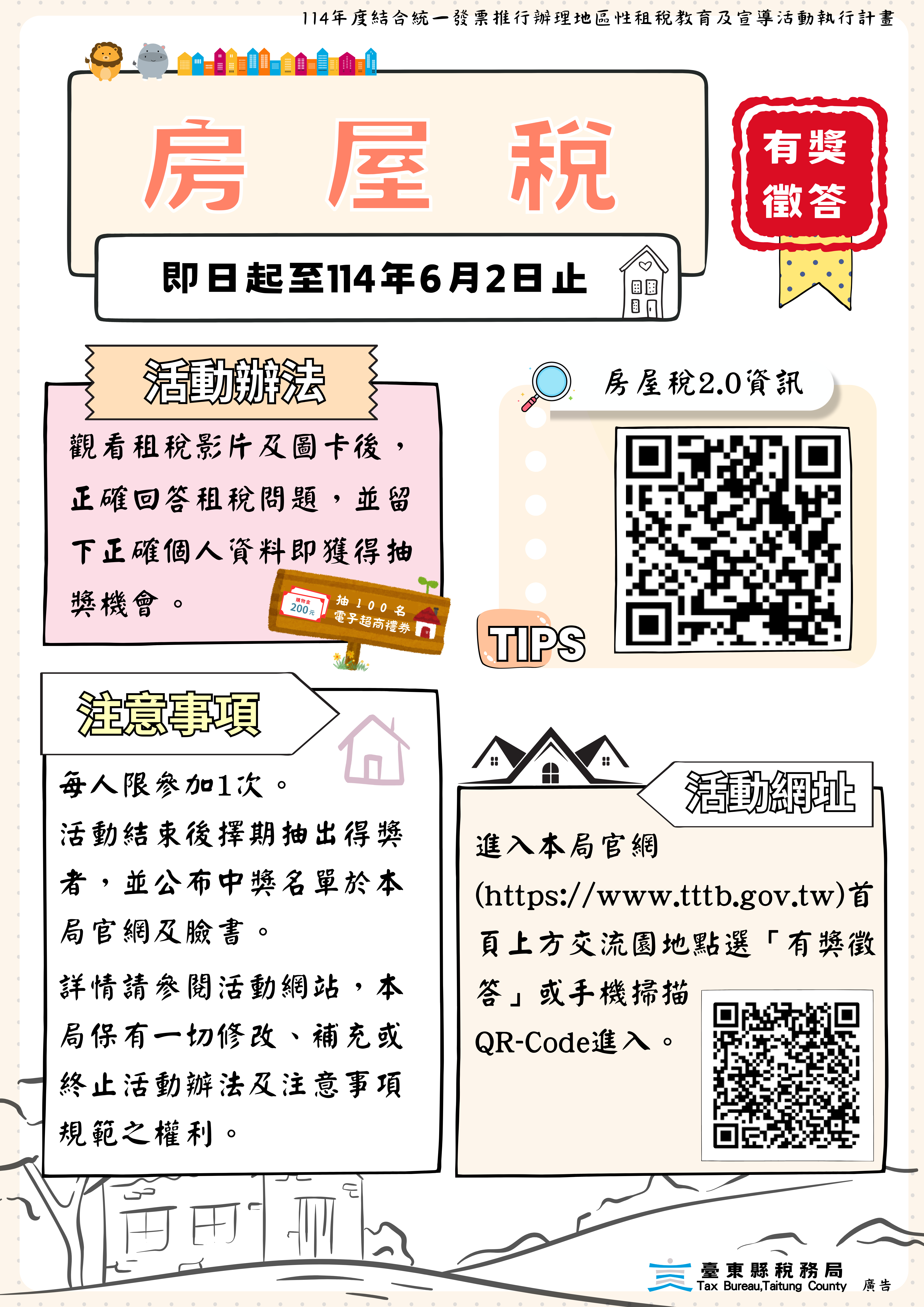 為加強民眾對房屋稅相關知識之了解,本局舉辦「114年漫遊線上有獎徵答-房屋稅篇」活動,鼓勵民眾踴躍參與。