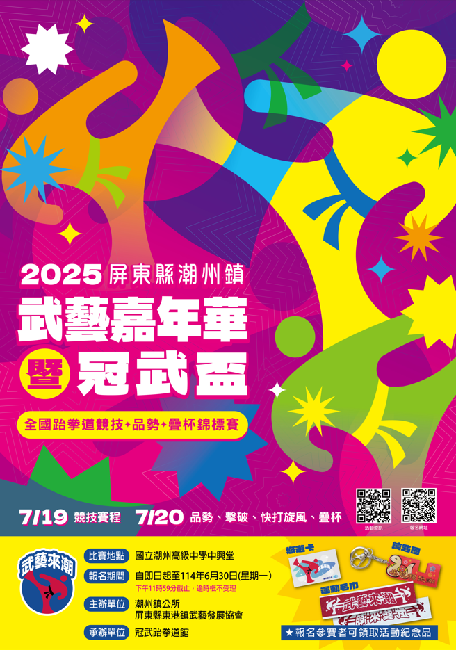 檢送「2025屏東縣潮州鎮武藝嘉年華暨冠武盃全國跆拳道競技、品勢、疊杯錦標賽」 Attachments: 2025屏東縣潮州鎮武藝嘉年華暨冠武盃全國跆拳道競技、品勢、疊杯錦標賽」實施辦法[ ]215 kB 上一篇 下一篇