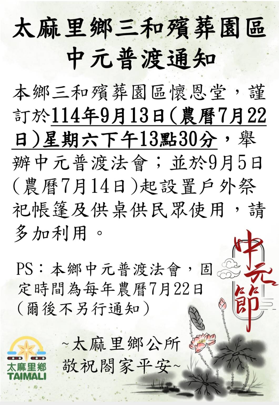 114年太麻里三和殯葬園區中元普渡通知
