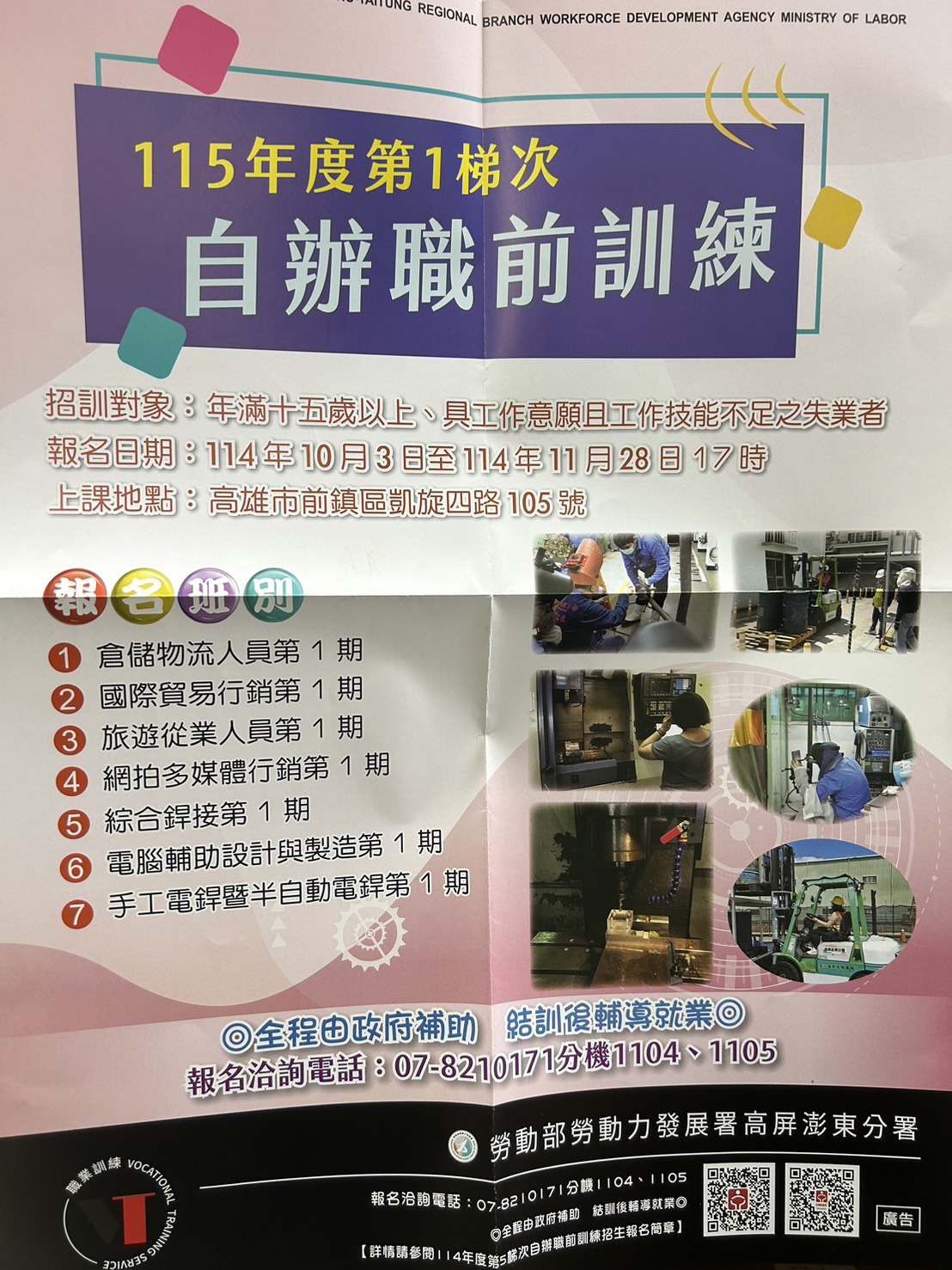 115年度第1梯次自辦職前訓練[倉儲物流人員第1期]等7班招生海報