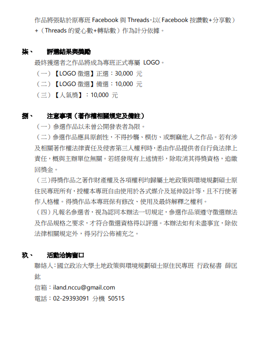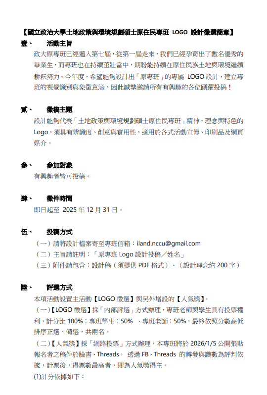 轉知國立政治大學本校土地政策與環境規劃碩士原住民專班辦理「 LOGO 設計徵選」,即日起開始徵件至2025年12月31日止