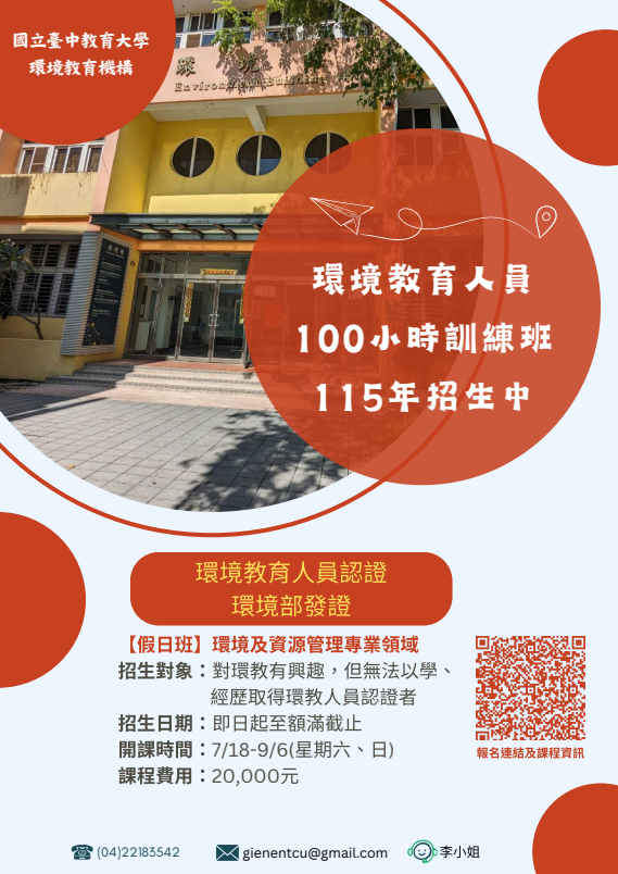函轉國立臺中教育大學115年度辦理「環境教育人員100小時訓練班」課程資訊