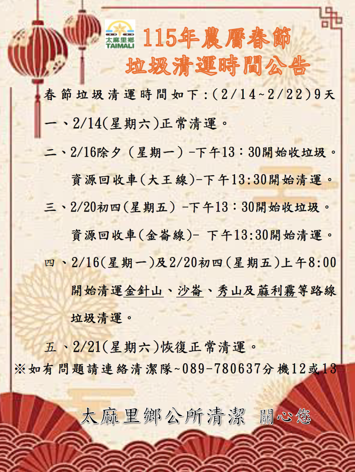 本鄉清潔隊 115年農曆春節垃圾清運時間公告