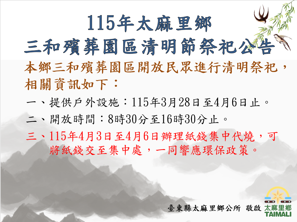 【公告】115年太麻里鄉三和殯葬園區清明節祭祀資訊 本鄉三和殯葬園區開放民眾進行清明祭祀,相關資訊如下: 一、提供戶外設施:115年3月28日至4月6日止。 二、開放時間:8時30分至16時30分止。 三、115年4月3日至4月6日辦理紙錢集中代燒,可將紙錢交至集中處,一同響應環保政策。 Attachments: 螢幕擷取畫面 2026-03-16 084203.png[ ]386 kB 上一篇 下一篇