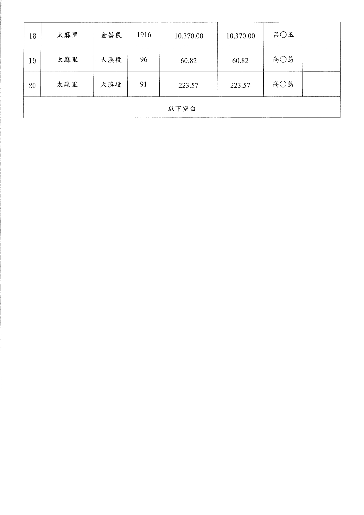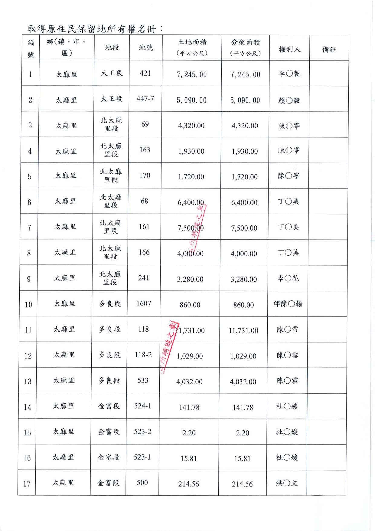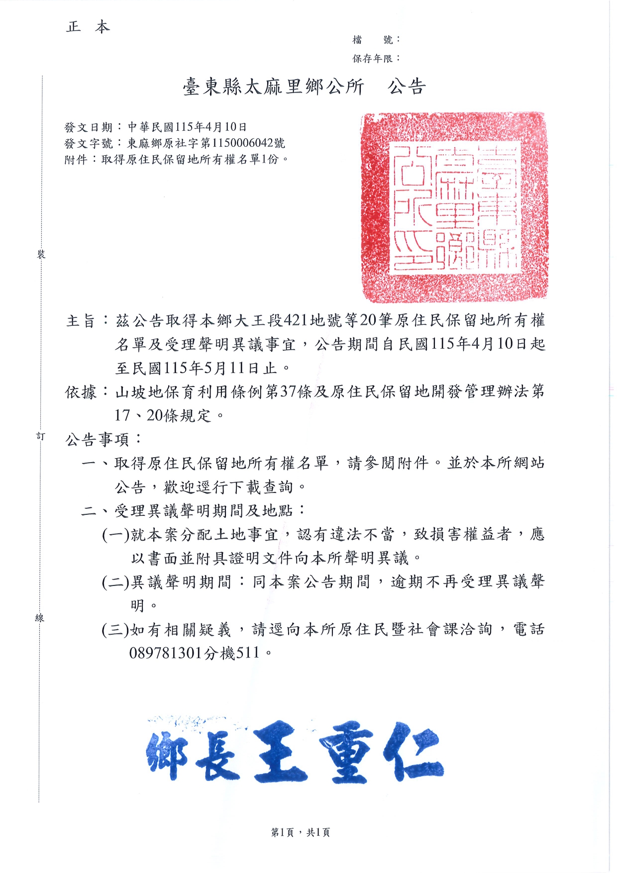 太麻里鄉大王段421地號等20筆原住民保留地所有權名單及受理聲明異議事宜