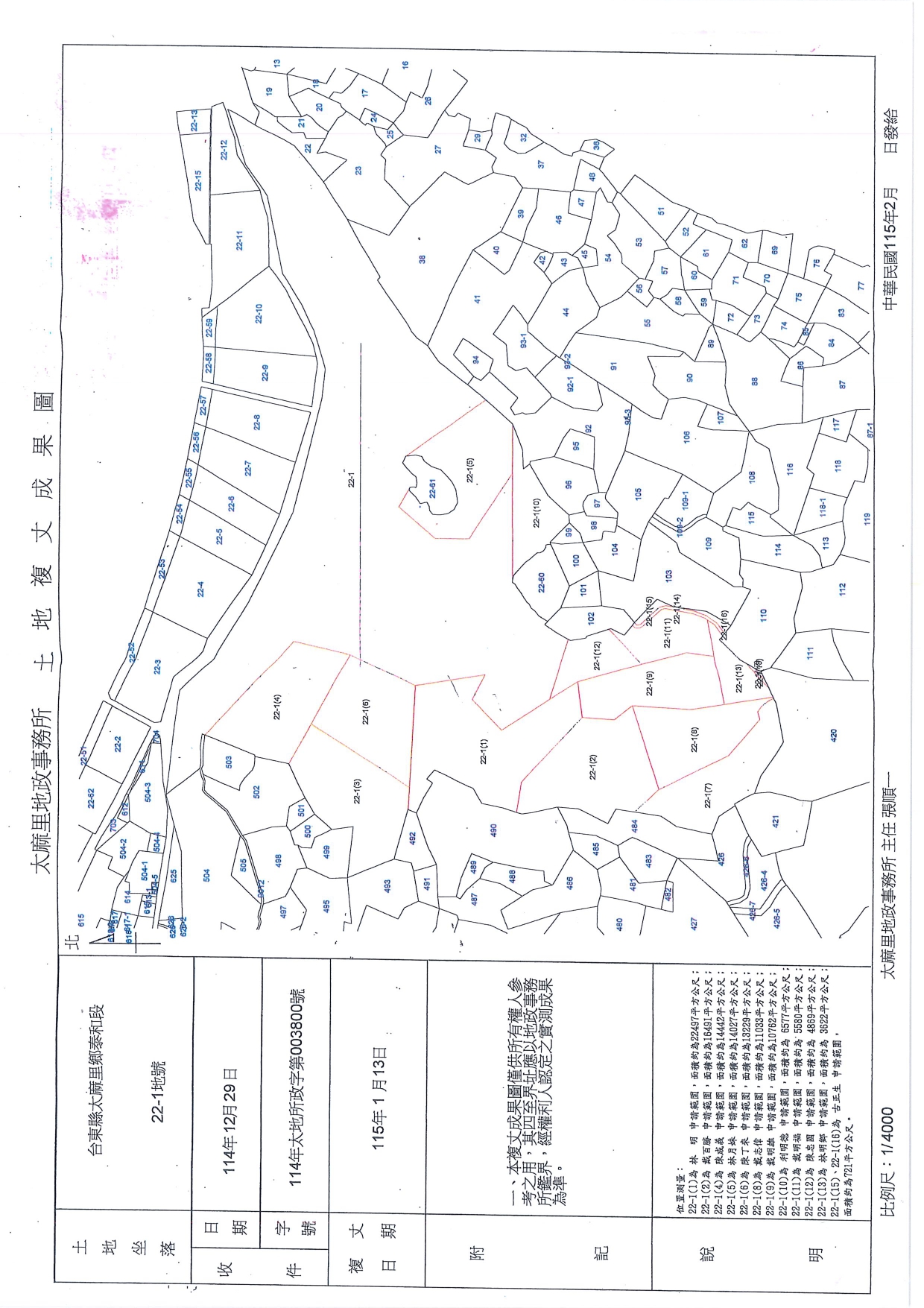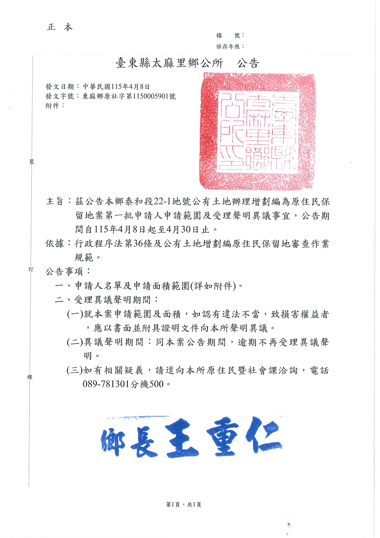 太麻里鄉泰和段22-1地號公有土地辦理增劃編為原住民保留地案第一批申請人申請範圍及受理聲明異議事宜