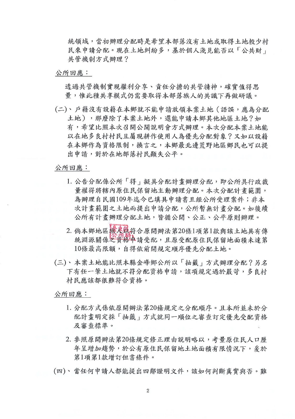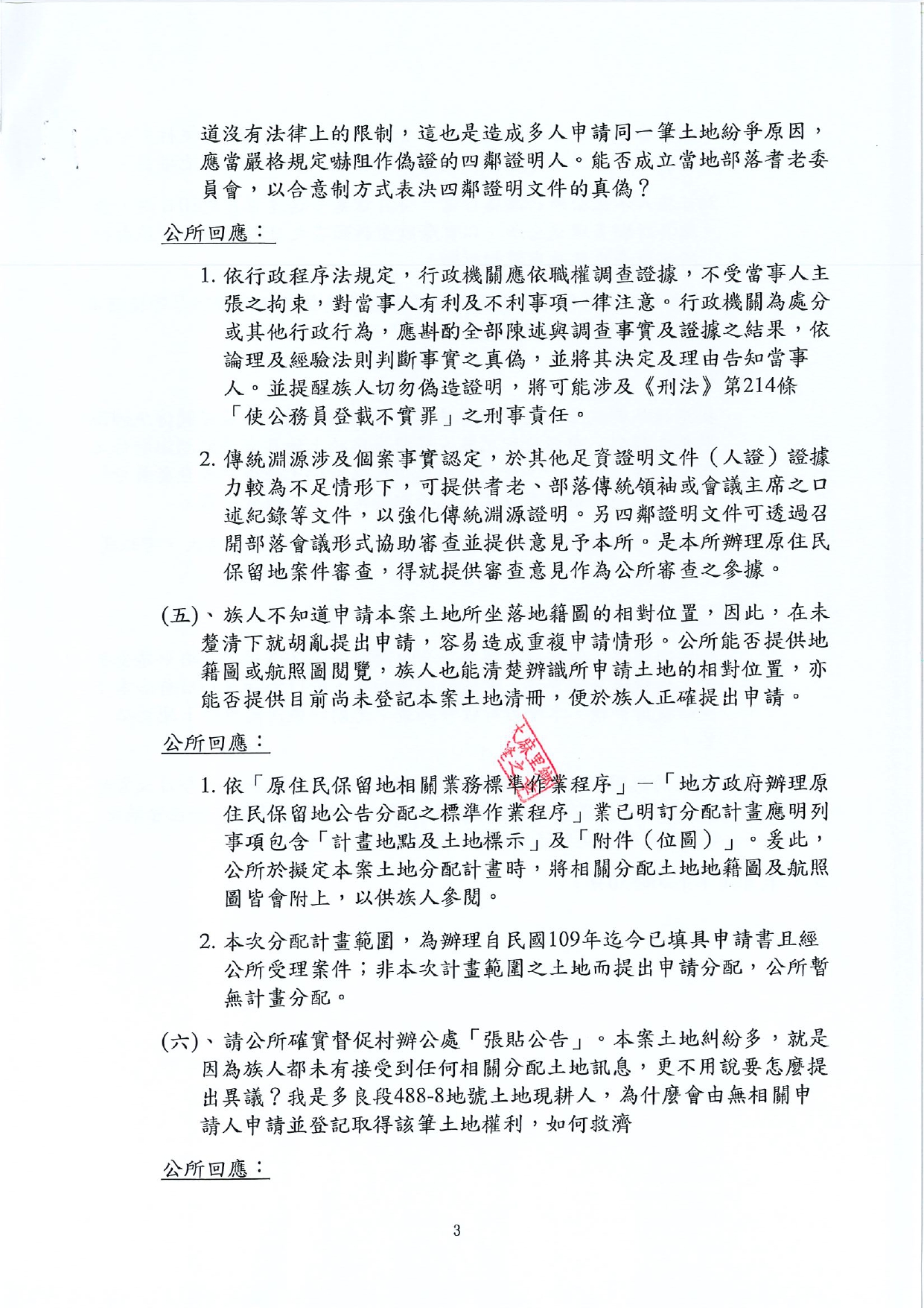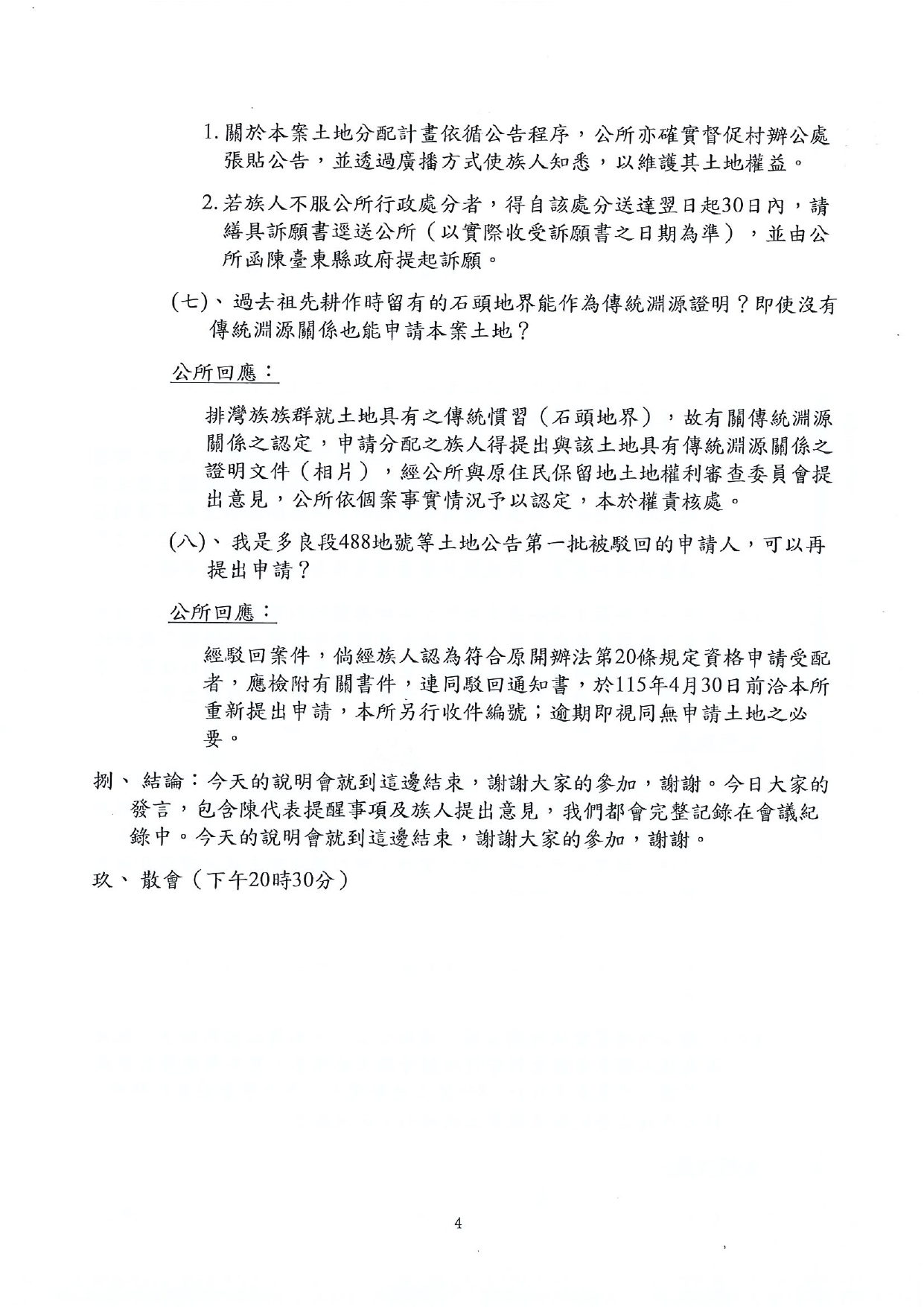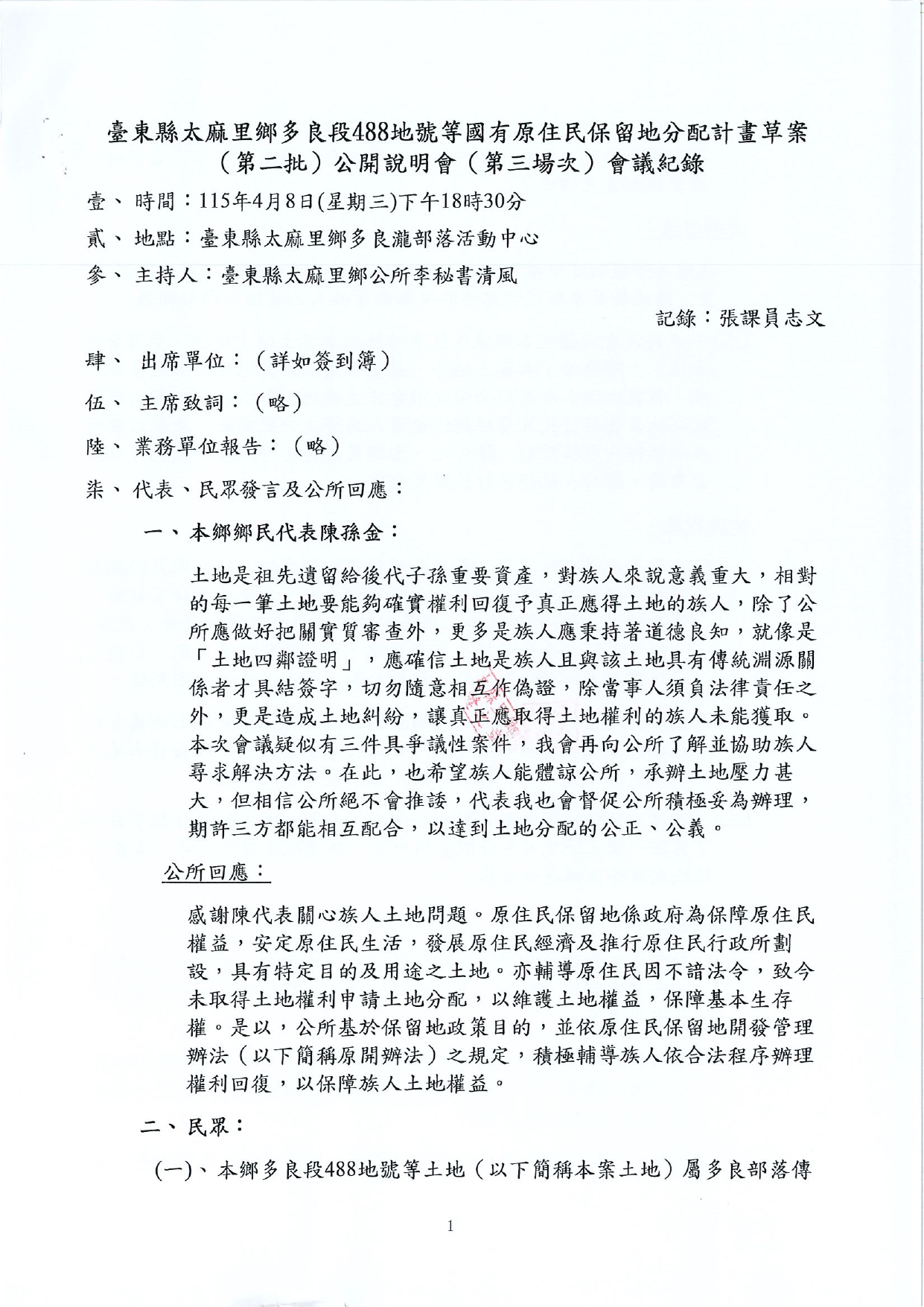 太麻里鄉多良段488地號等國有原住民保留地分配計畫草案(第二批)公開說明會(第三場次)會議紀錄一份