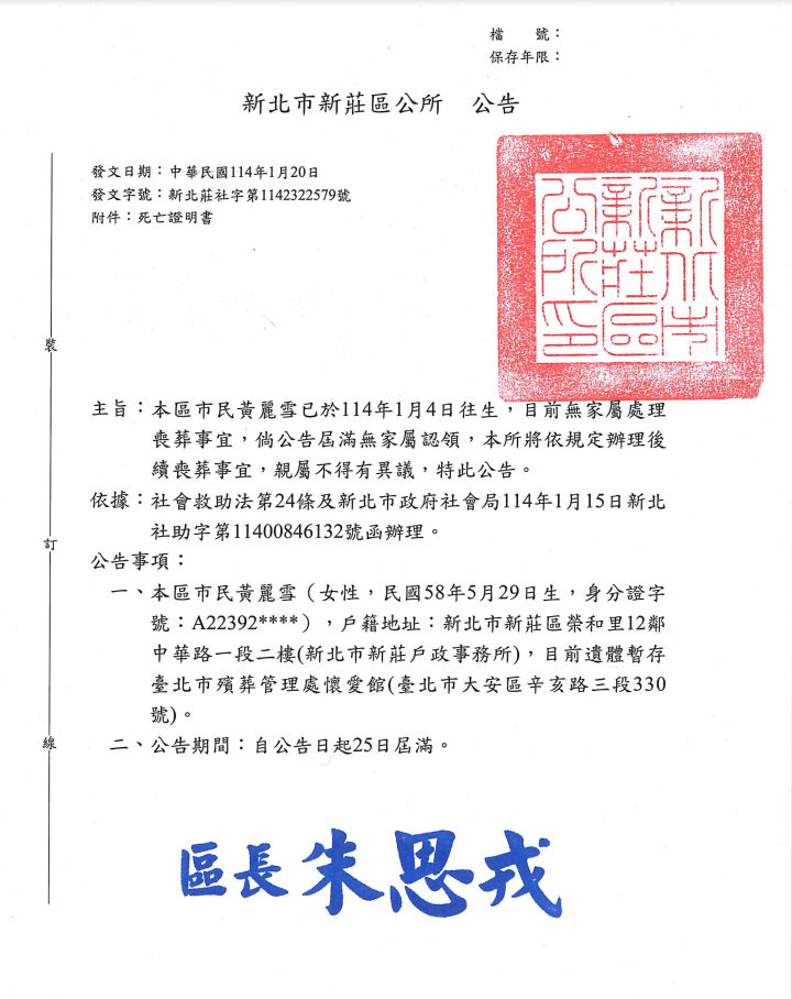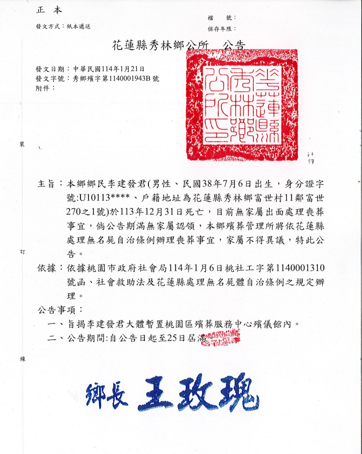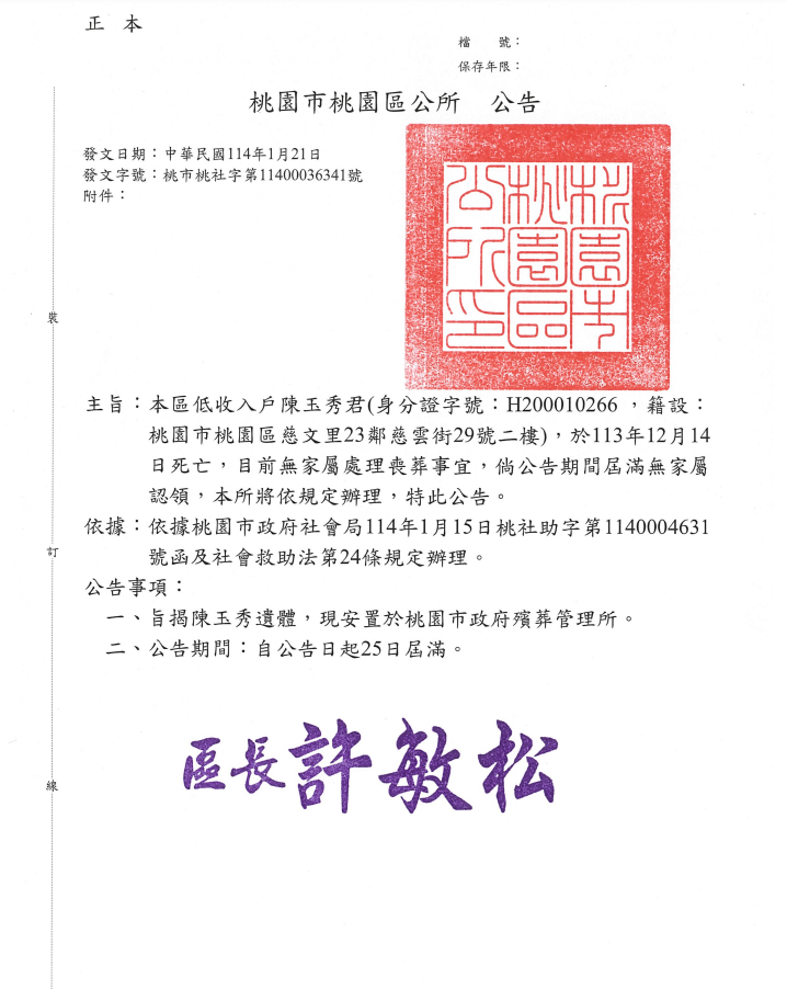 函轉3縣市函發死亡公告4份-250207