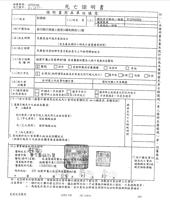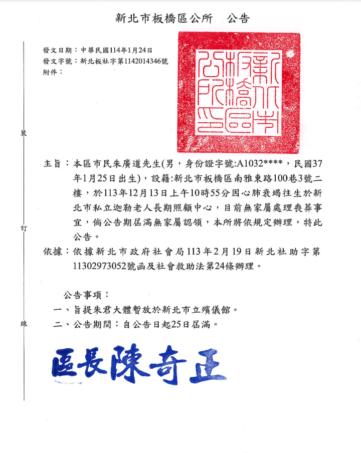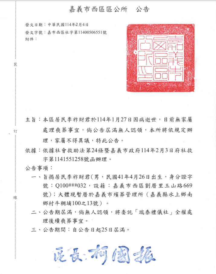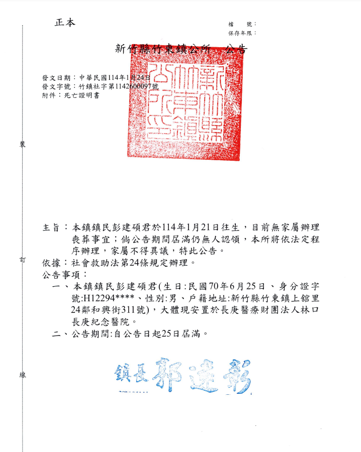 • /函轉4縣市函發死亡公告4份-250212