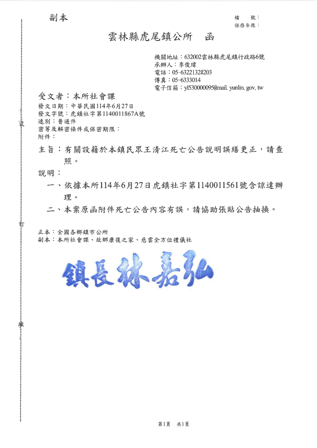 有關設籍於雲林縣虎尾鎮民眾 王清江 死亡公告
