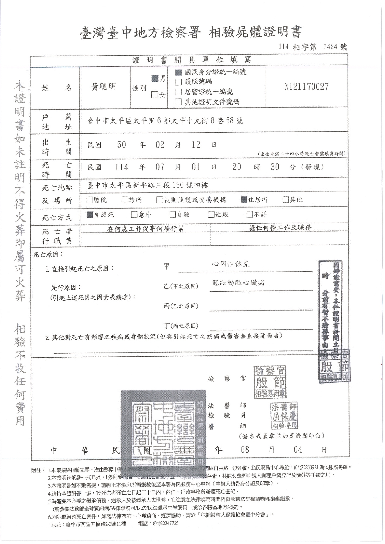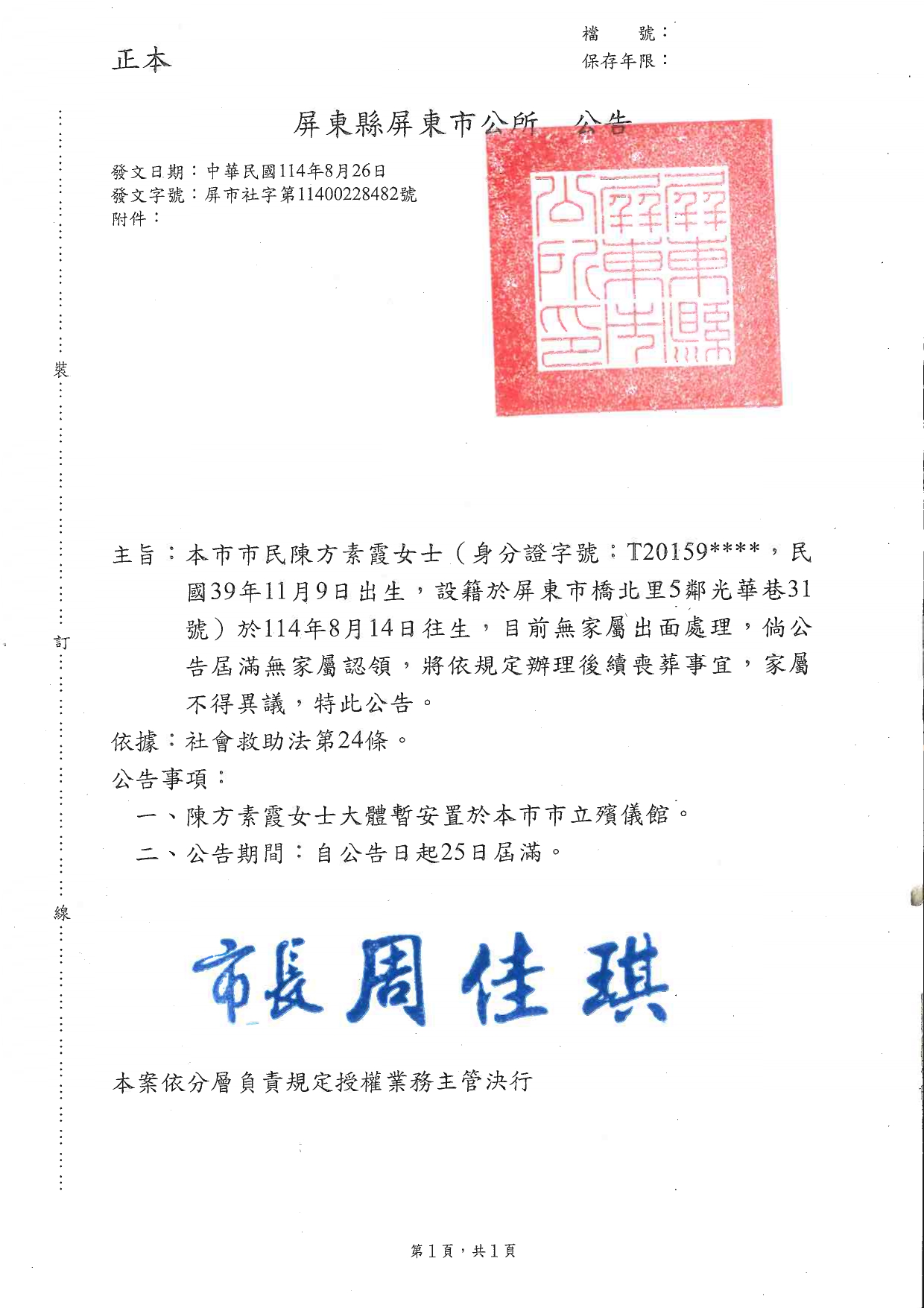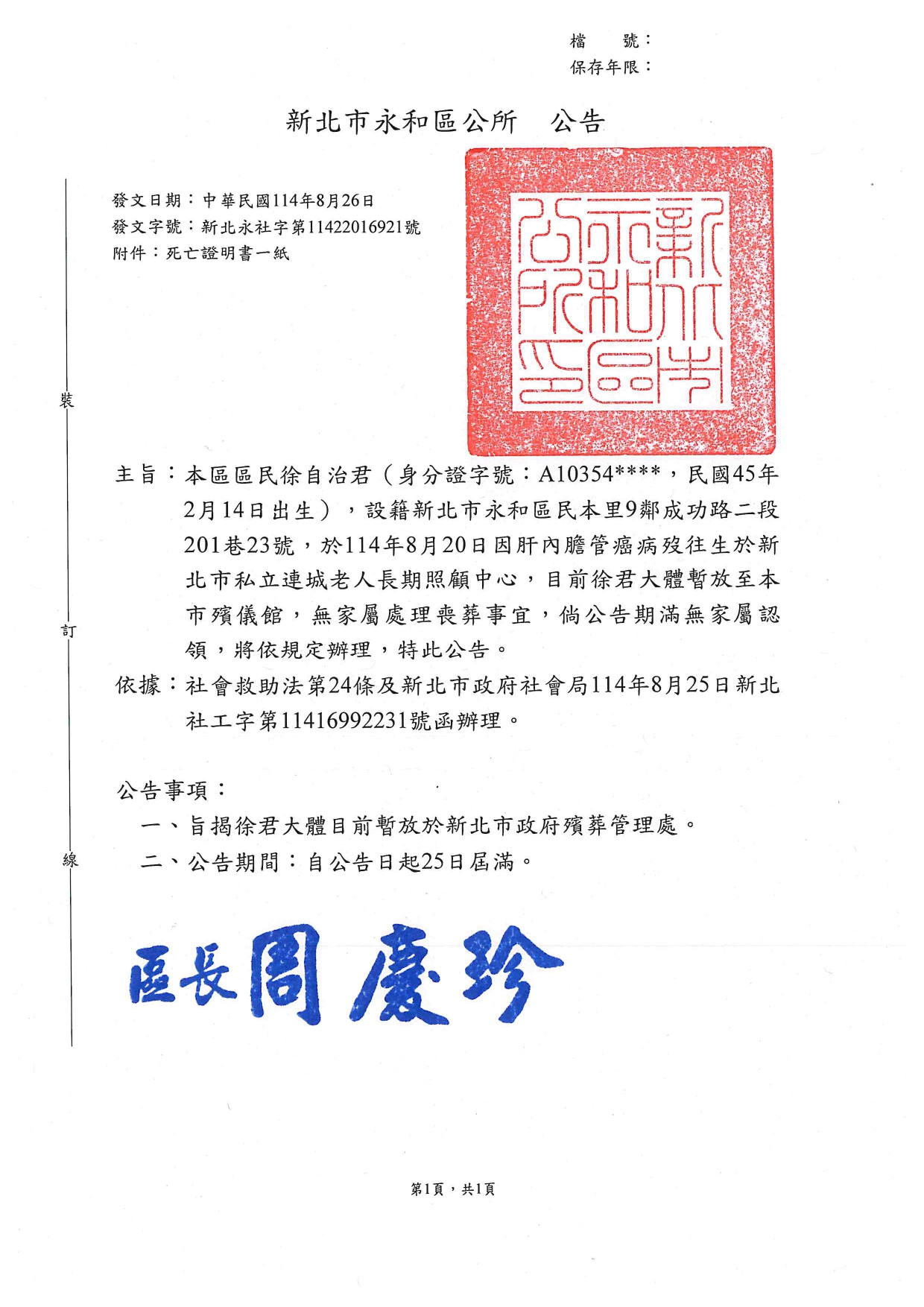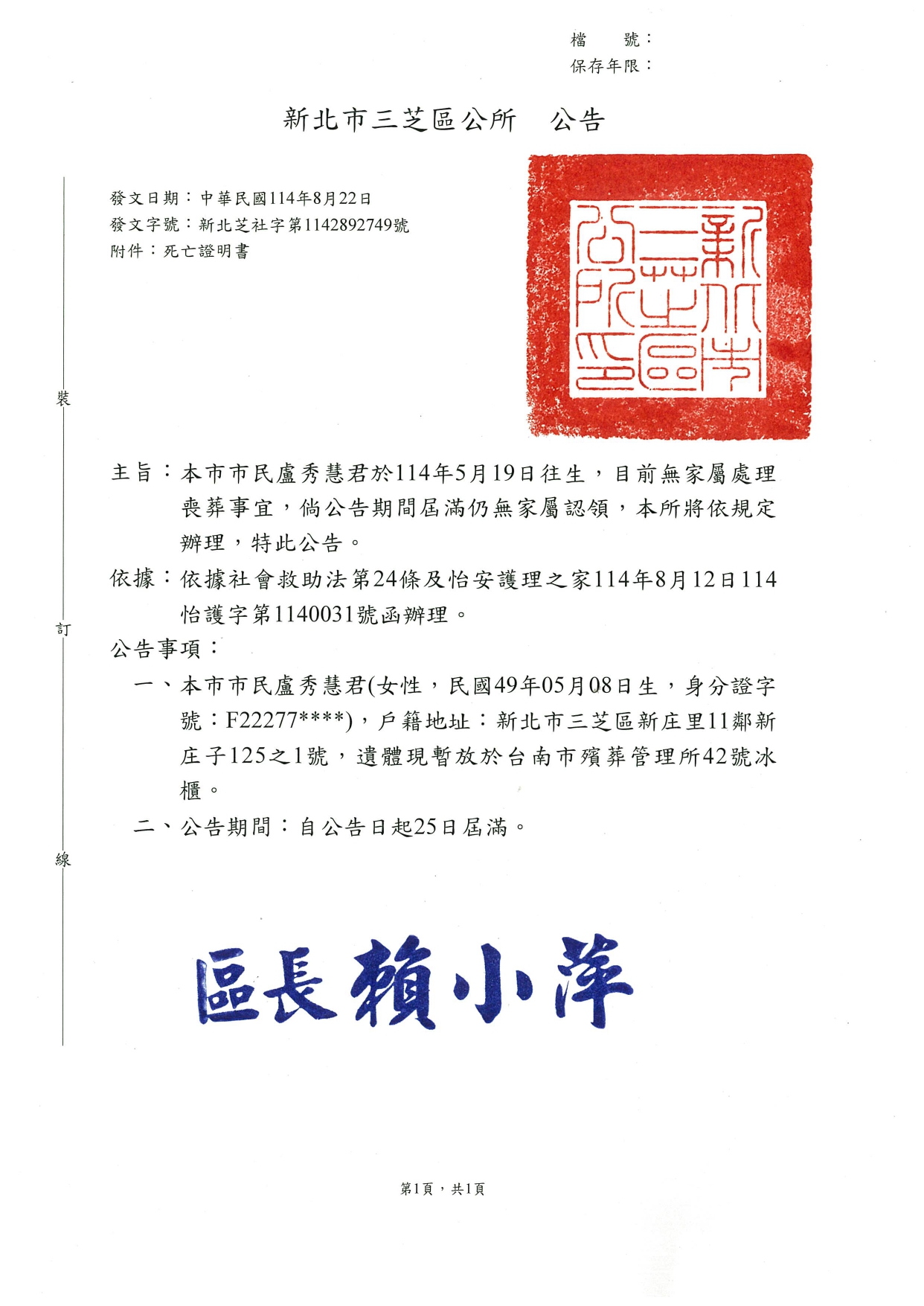 函轉3縣市函發死亡公告4份20250902-1
