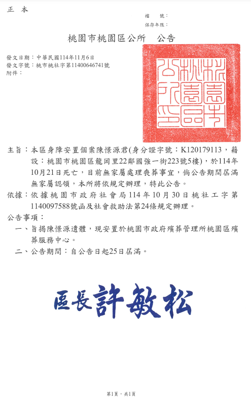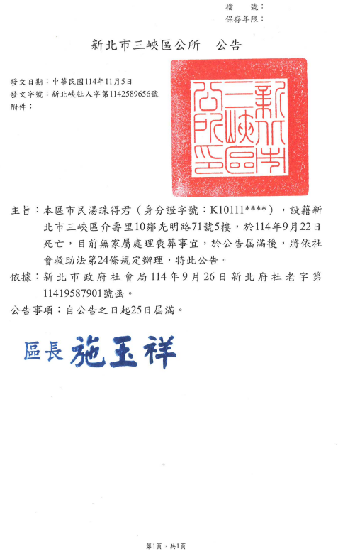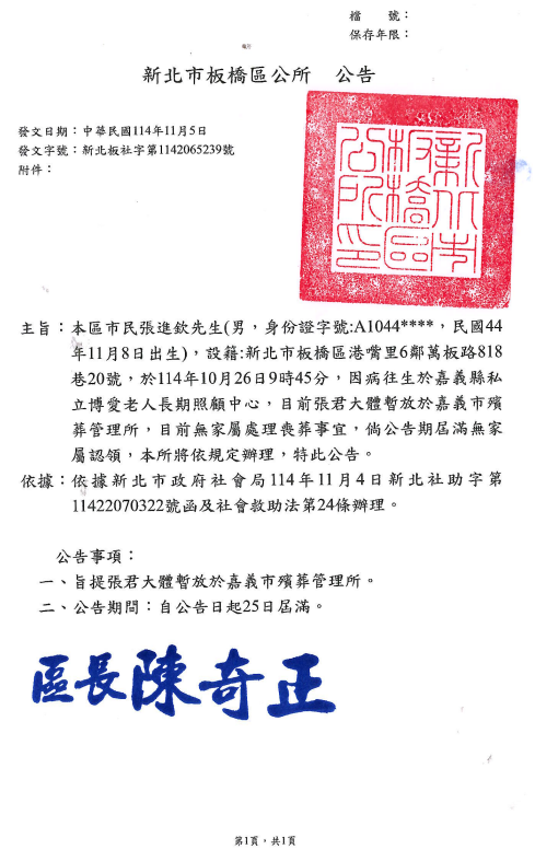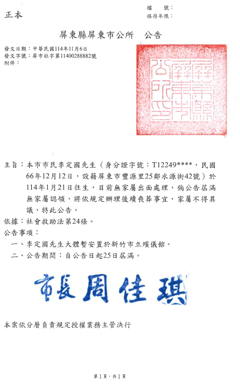 函轉2縣市函發死亡公告4份
