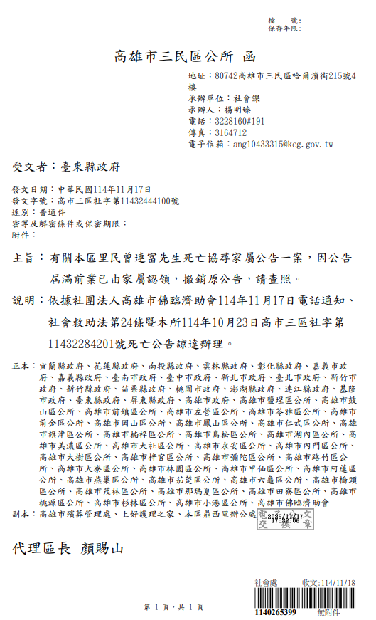 函轉高雄市三民區公所函發撤銷死亡公告1份