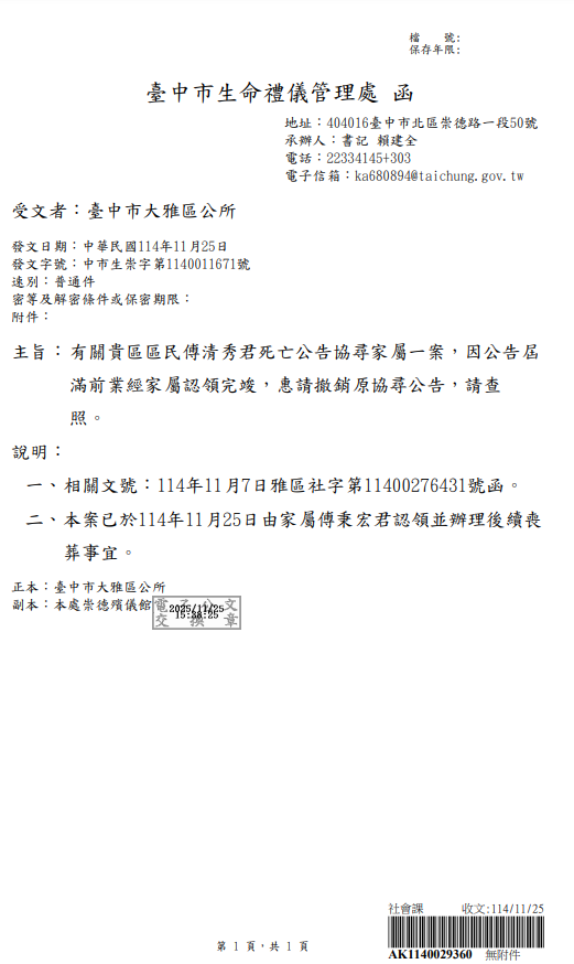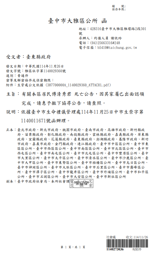 函轉臺中市大雅區公所函發撤銷死亡公告1份