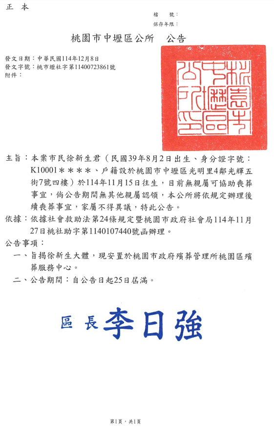 • /函轉桃園市中壢區公所函發補正死亡公告1份