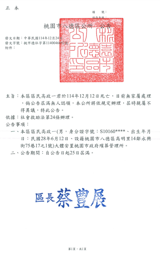 • 死亡尋親公告