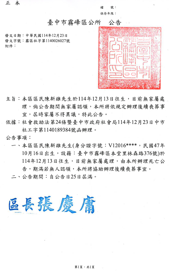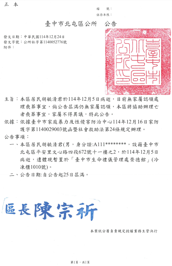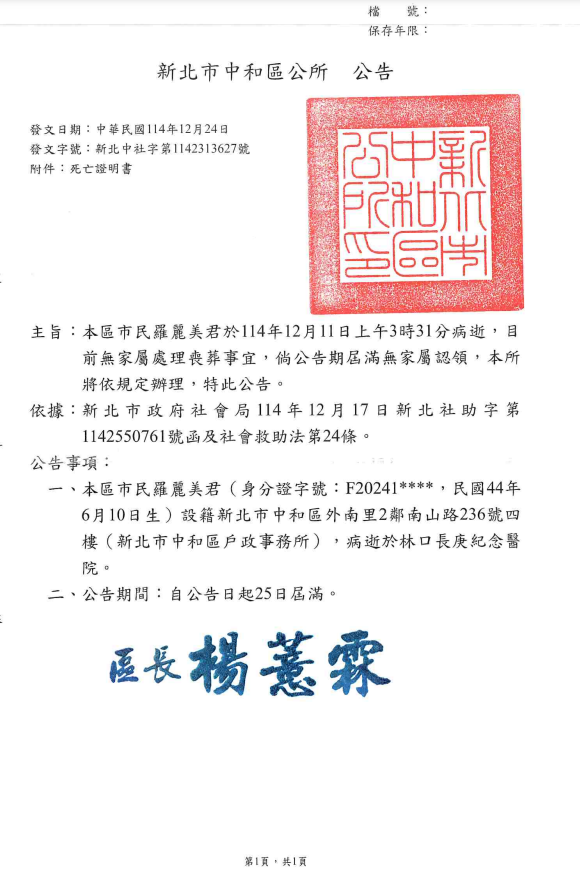 函轉3縣市函發死亡公告4份