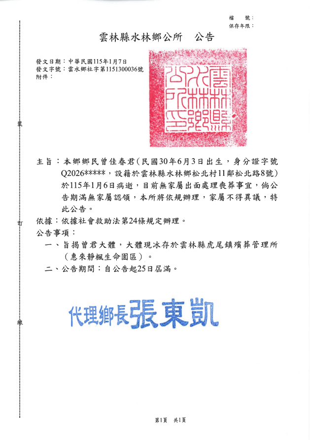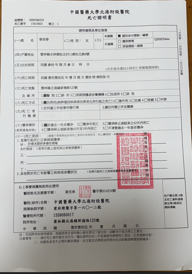 ( 檢送 ) 雲林縣水林鄉鄉民曾o春君死亡公告及死亡證明書各1份