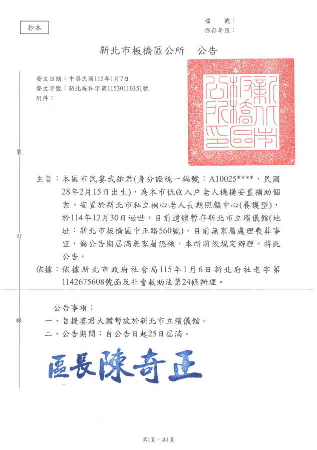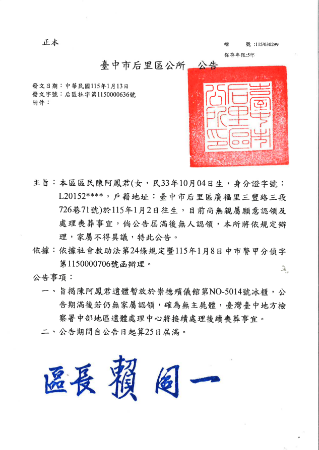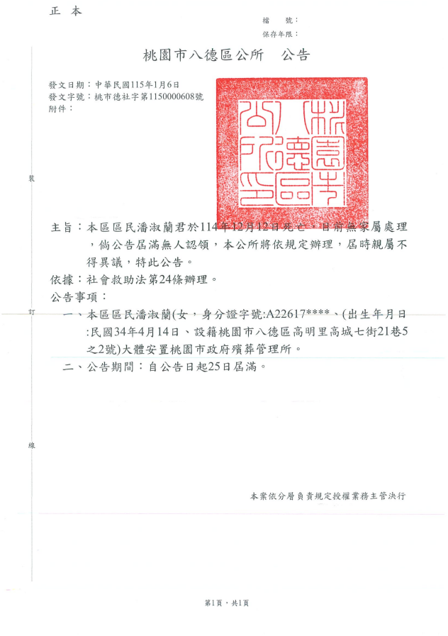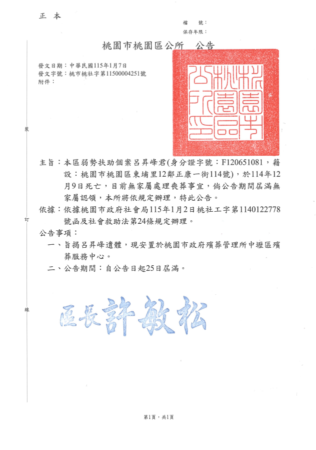 • /函轉3縣市函發死亡公告4份-26.01.20-3
