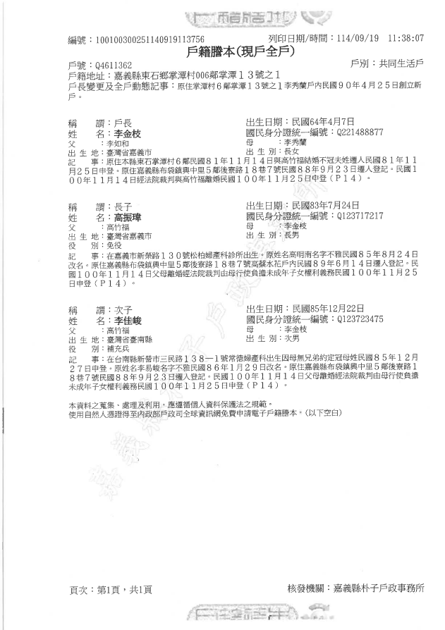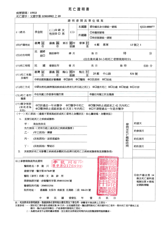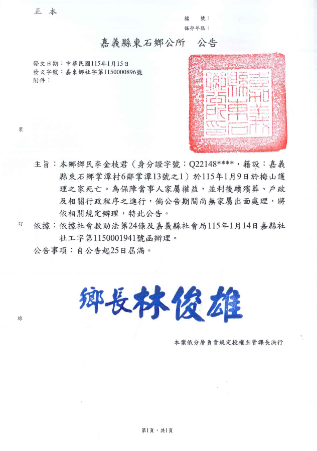 檢送嘉義縣東石鄉鄉民李金O君死亡公告