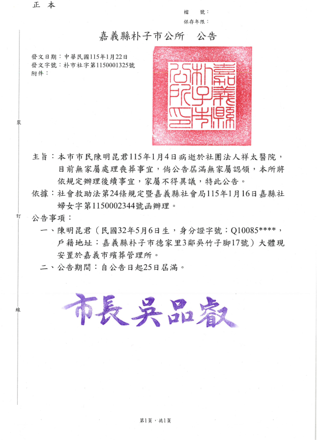 檢送嘉義縣朴子市公所陳O昆君死亡公告
