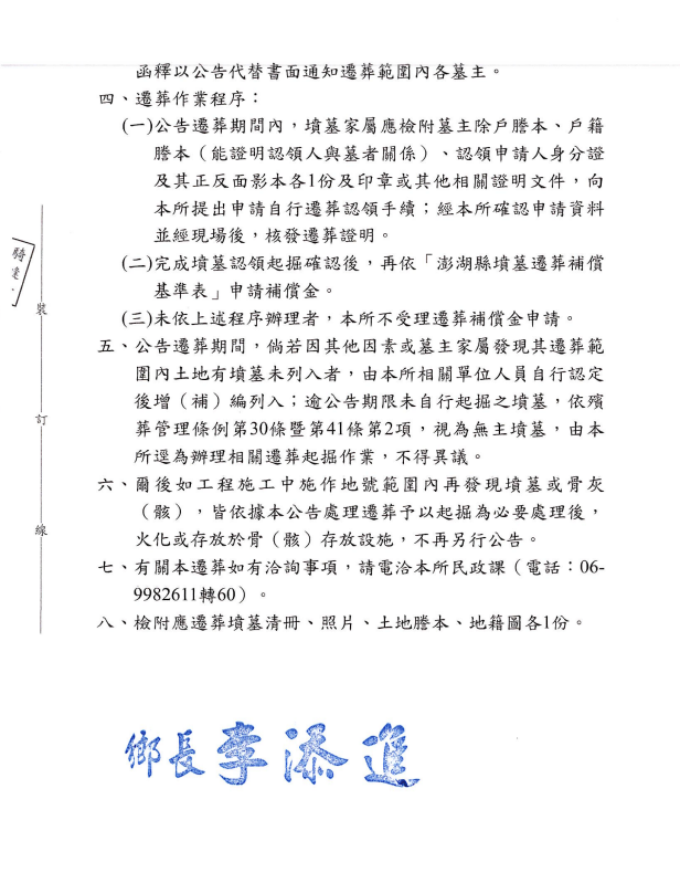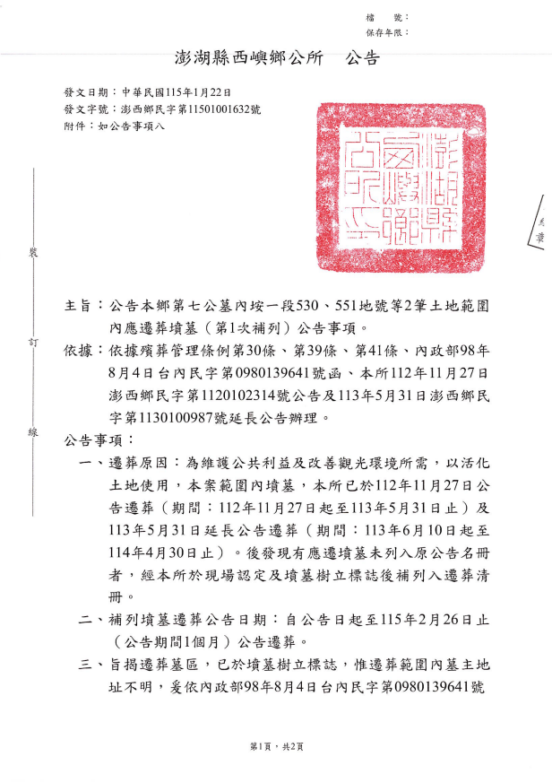 檢送 澎湖縣西嶼鄉公所第七公墓內垵一段530、551地號等2筆土地範圍內應遷葬墳墓(第1次補列)公告