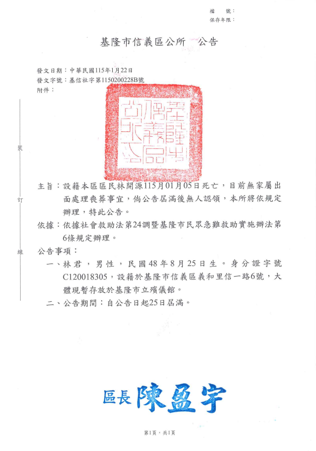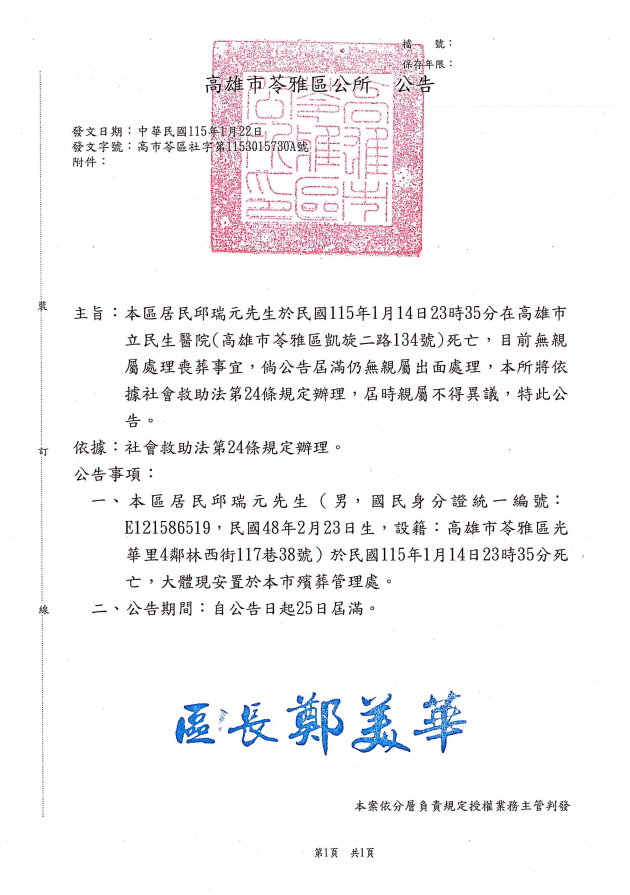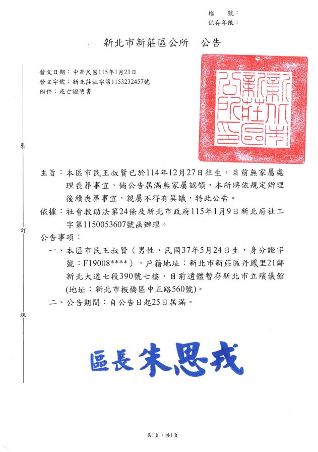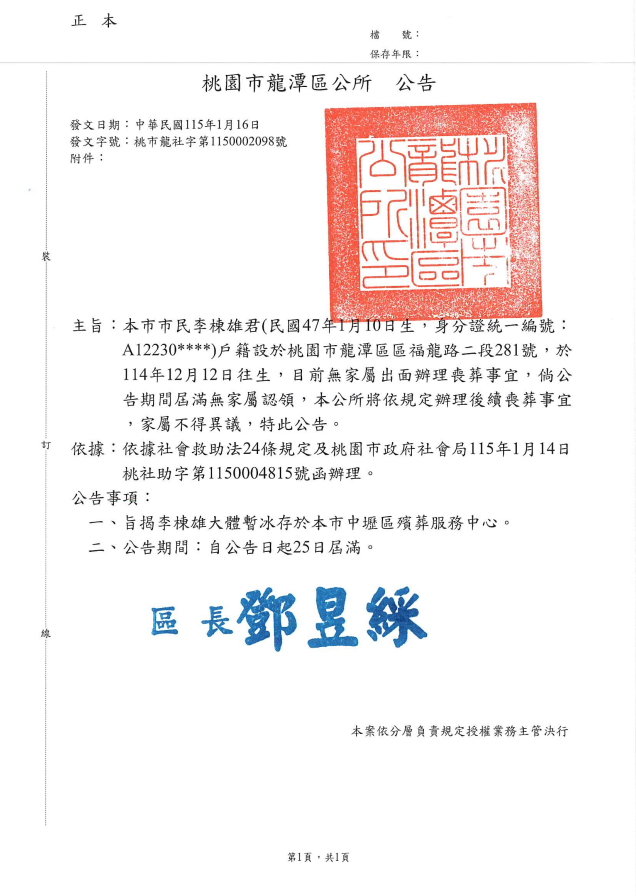 • /函轉4縣市函發死亡公告4份-26.01.28