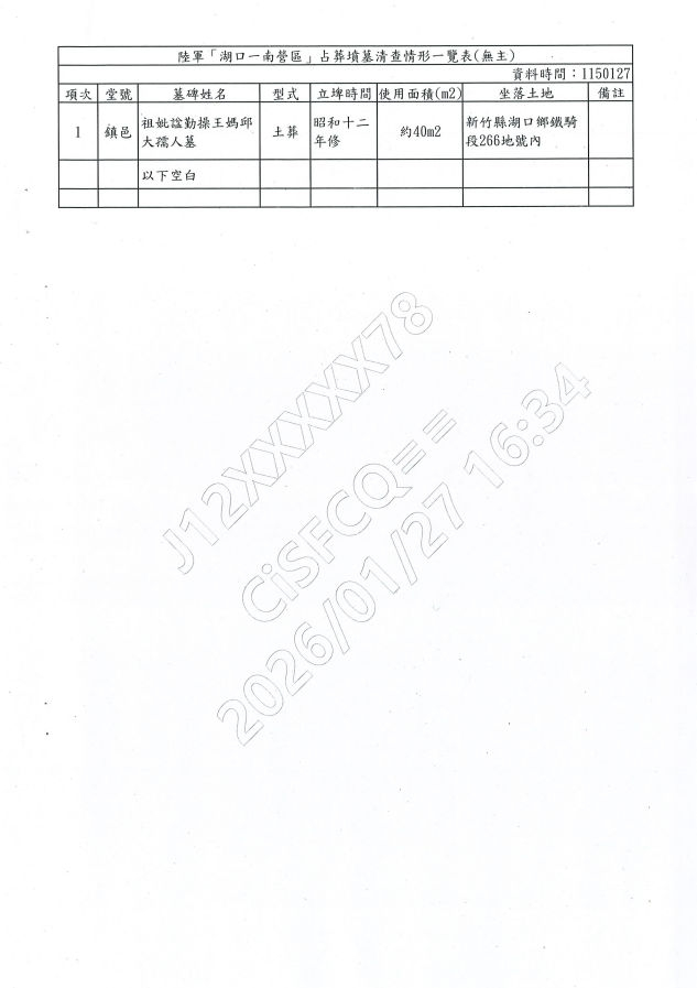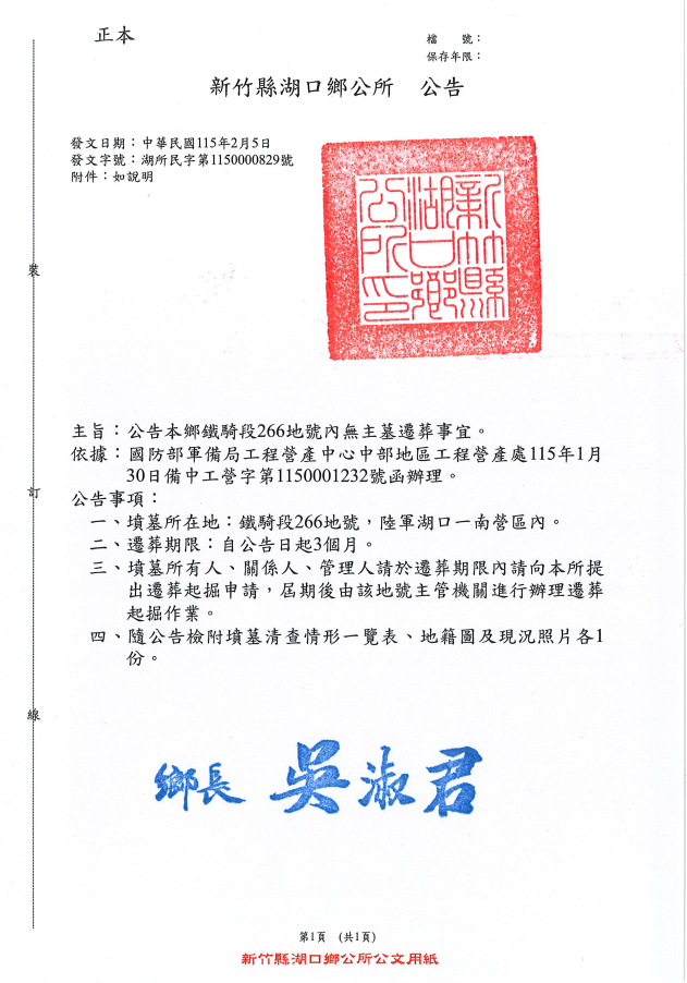公告新竹縣湖口鄉 鐵騎段266地號(陸軍湖口一南營區內)無主墓遷葬事宜