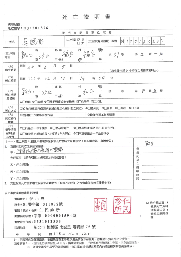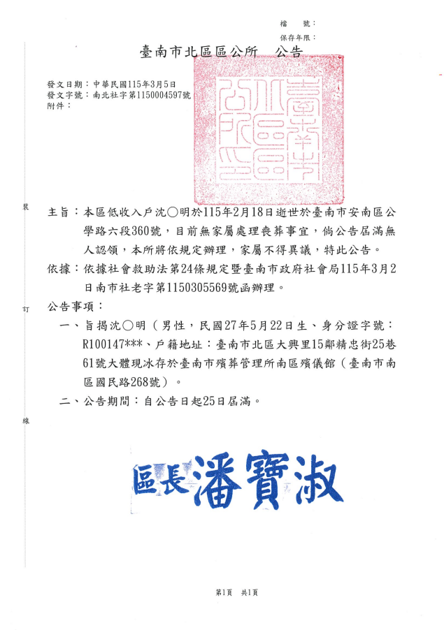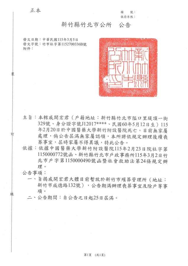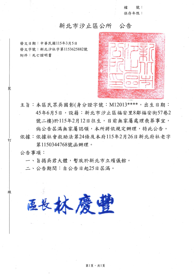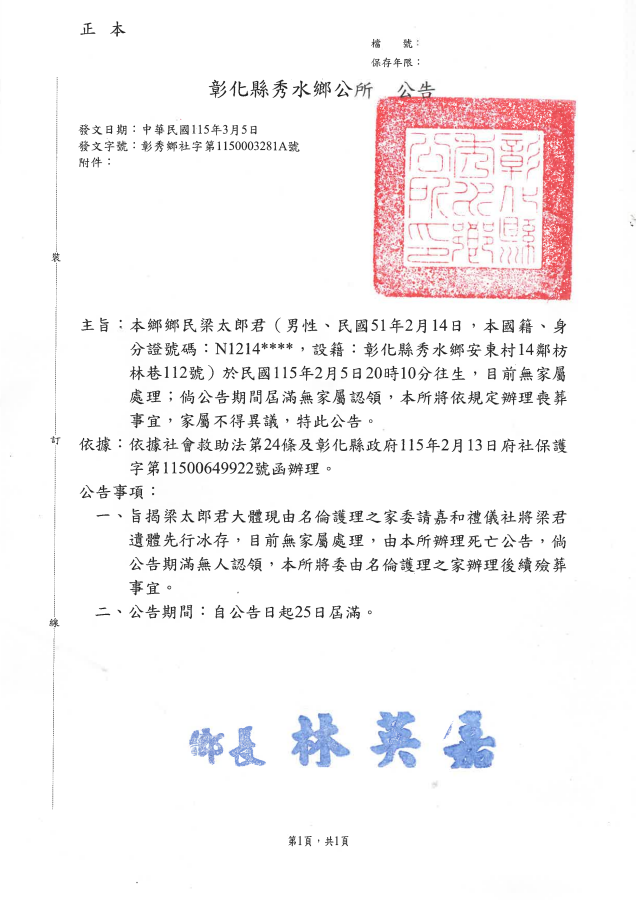 函轉4縣市函發死亡公告4份-115年3月13日