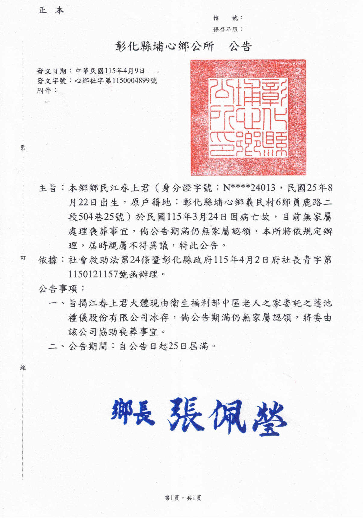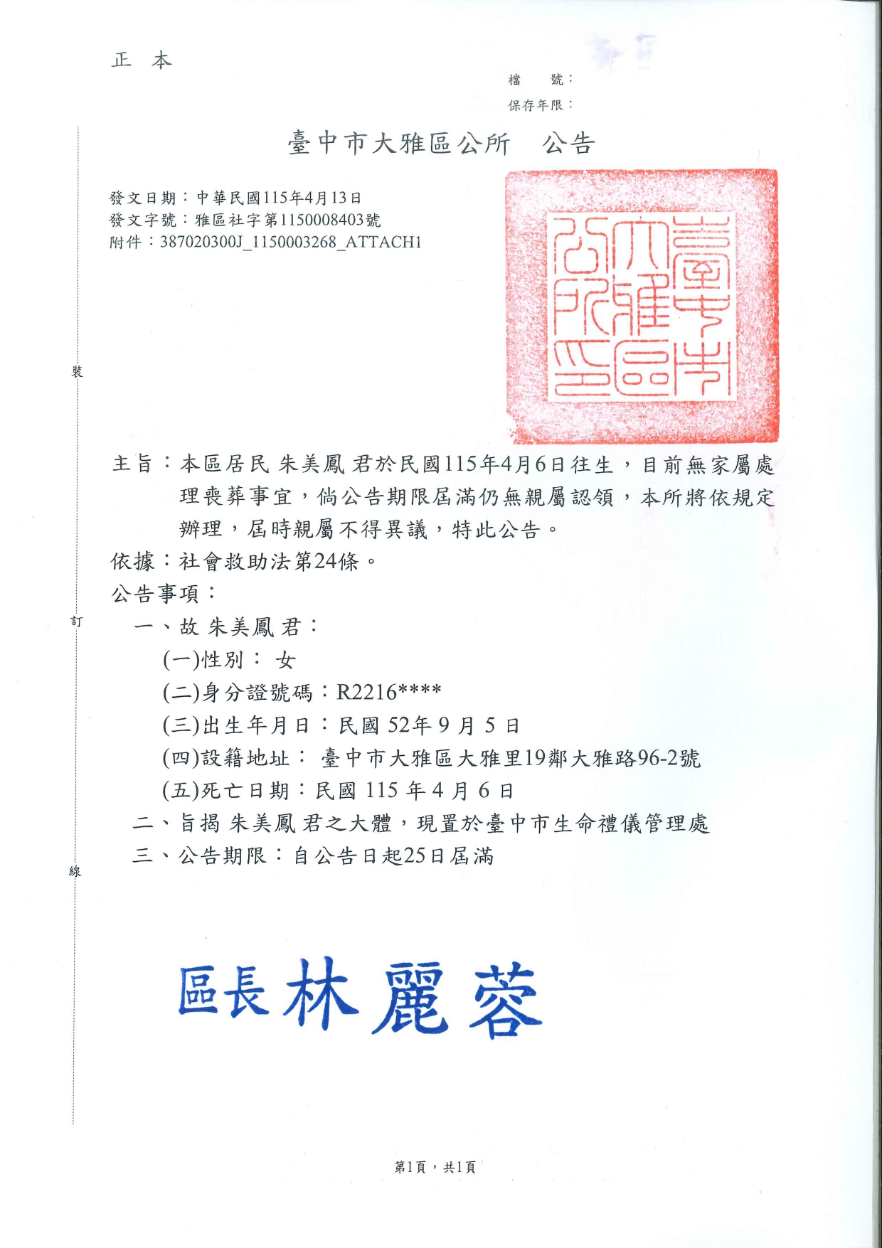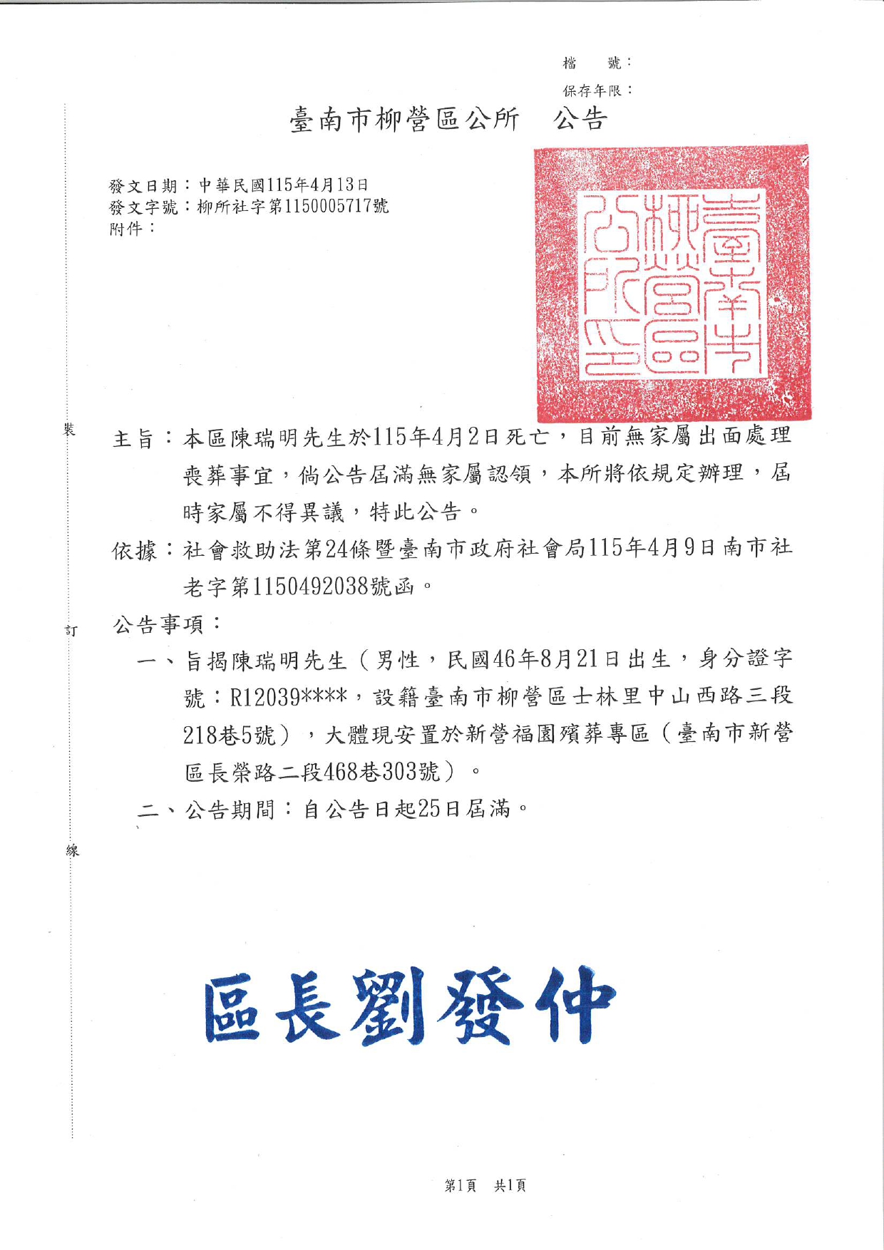 函轉3縣市函發死亡公告4份-26.04.15