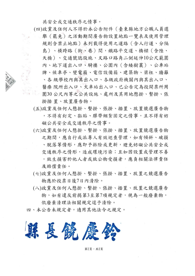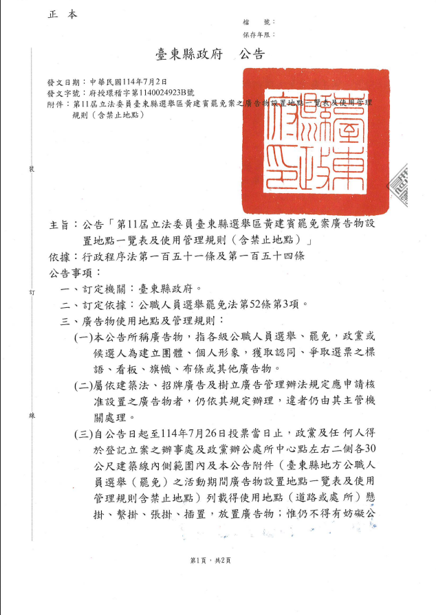 • /檢送「第11屆立法委員臺東縣選舉區黃建賓罷免案之廣告物設置地點一覽表及使用管理規則(含禁止地點)」公告