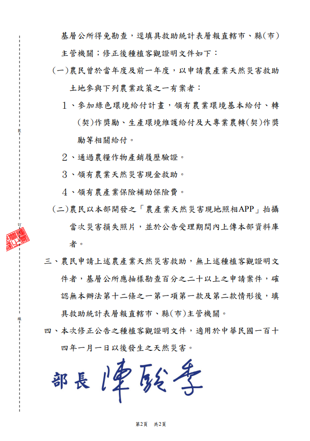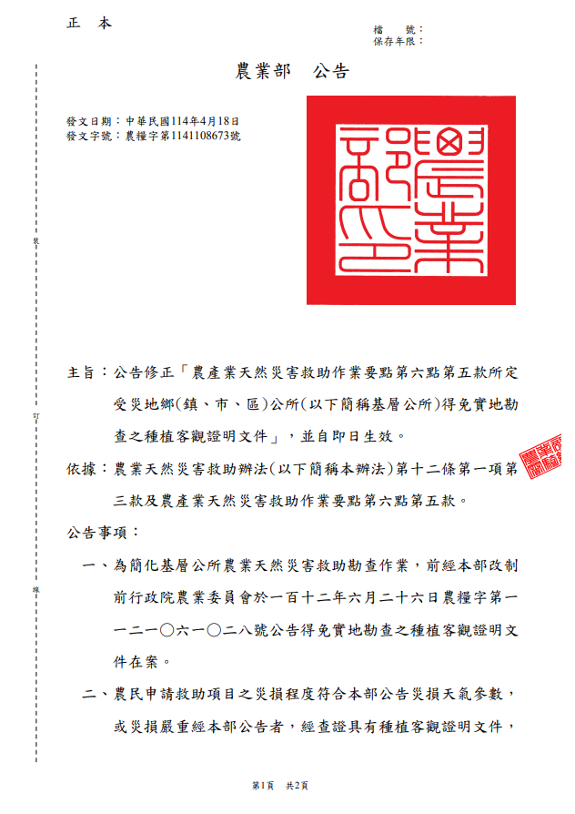 依據農業部114年4月18日農糧字第1141108673號公告,申請農產業天然災害救助者,如能提供下列任一種植客觀證明文件,即可免除實地勘查,逕由基層公所核實後填報統計表: