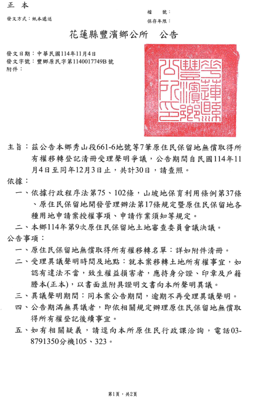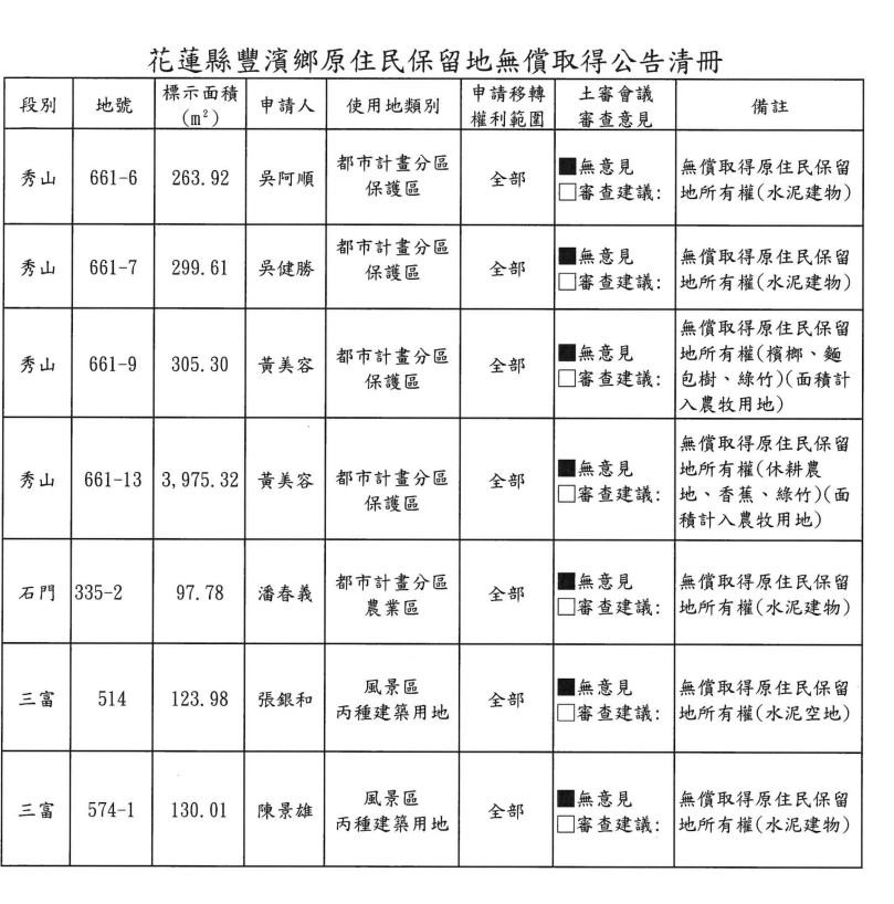 (檢送)花蓮縣豐濱鄉公所本鄉秀山段661-6地號等7筆原住民保留地無償取得所有權移轉登記清冊一案