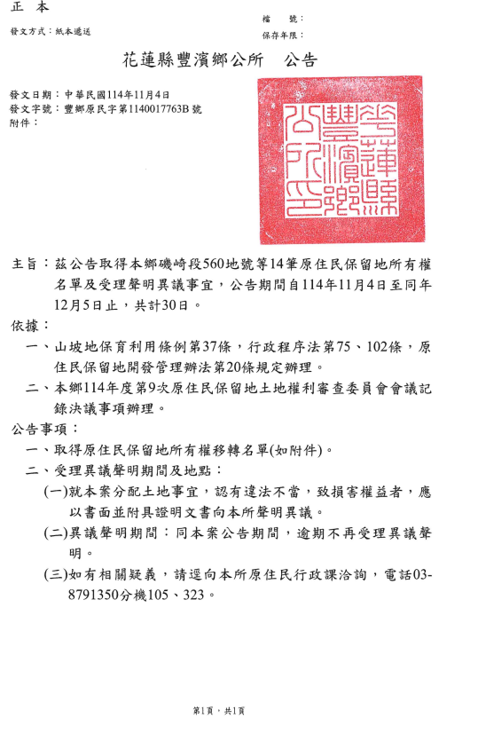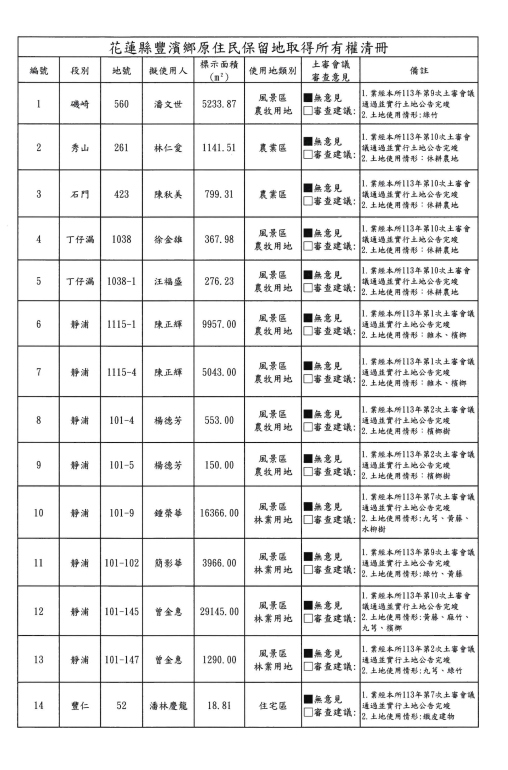 (檢送)花蓮縣豐濱鄉公所取得本鄉磯崎段560地號等14筆原住民保留地所有權名單公告1份