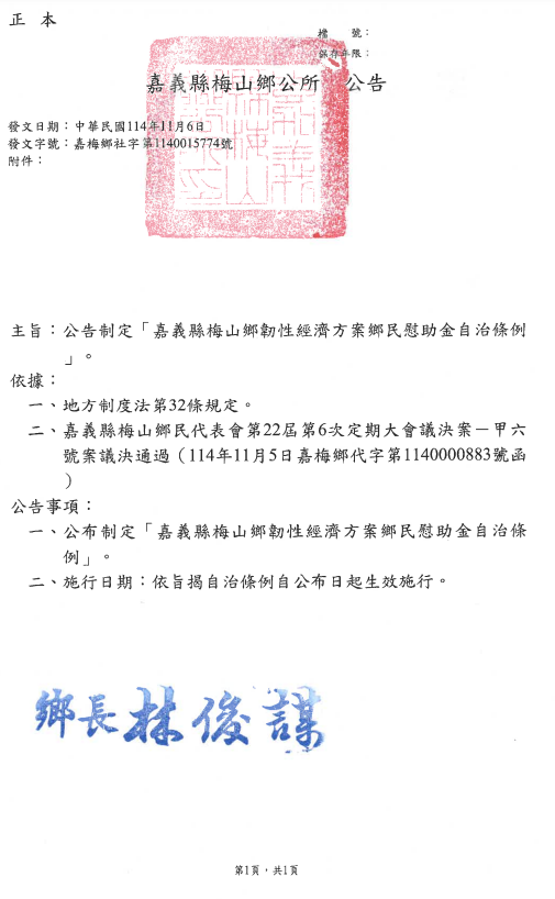 檢送「嘉義縣梅山鄉韌性經濟方案鄉民慰助金自治條例」公告、令、總說明、自治條例及逐條說明表各一份 Attachments: 376506500A_1140015784_ATTACH1.pdf[ ]346 kB 上一篇 下一篇