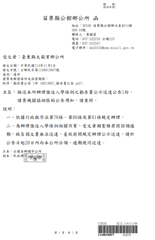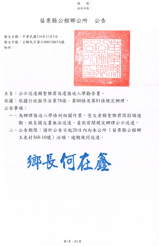 (檢送)苗栗縣公館鄉公所辦理強迫入學條例之勸告書公示送達公告1份