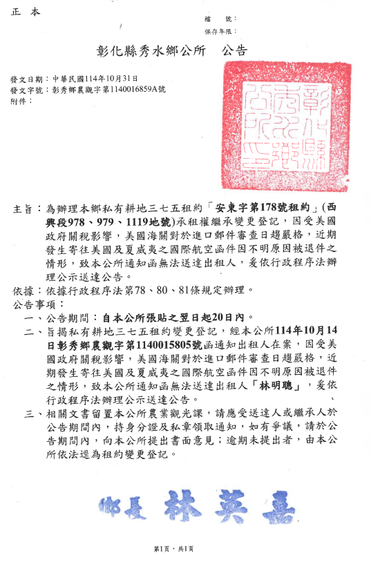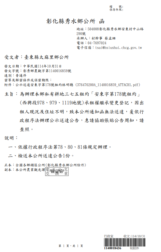 檢送彰化縣秀水鄉公所私有耕地三七五租約「安東字第178號租約」(西興段978、979、1119地號)承租權繼承變更登記,因出租人現況及住址不明,致本公所通知函無法送達,爰依行政程序法辦理公示送達公告 上一篇 下一篇