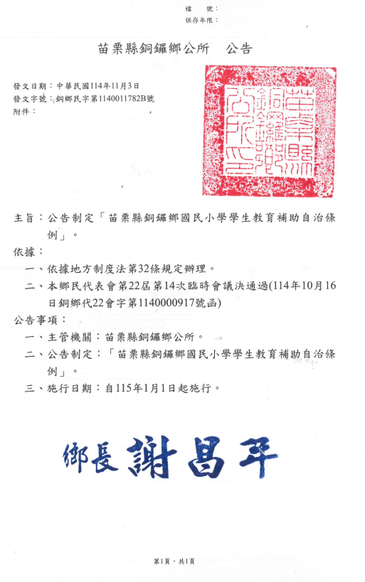 檢送「苗栗縣銅鑼鄉國民小學學生教育補助自治條例」公告、令、總說明及逐條說明各1份 Attachments: 376506400A_1140019375_ATTACH1 (1).pdf[ ]1405 kB 上一篇 下一篇