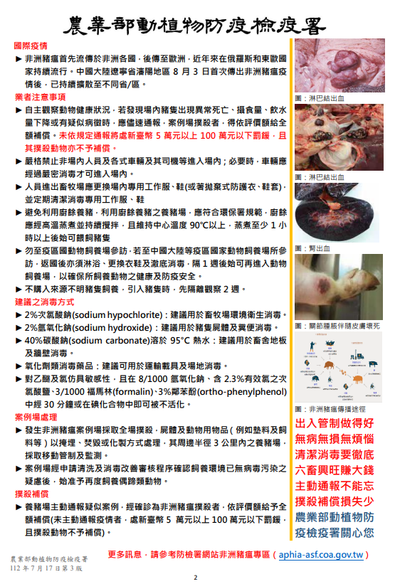 Fever(ASF)」宣導單張如附件,請加強宣(輔)導所轄(屬)養豬場或會員及相關業者,加強落實生物安全及衛生管理等防疫事宜公告