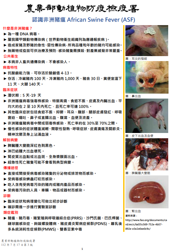 檢送「認識非洲豬瘟African Swine Fever(ASF)」宣導單張如附件,請加強宣(輔)導所轄(屬)養豬場或會員及相關業者,加強落實生物安全及衛生管理等防疫事宜公告