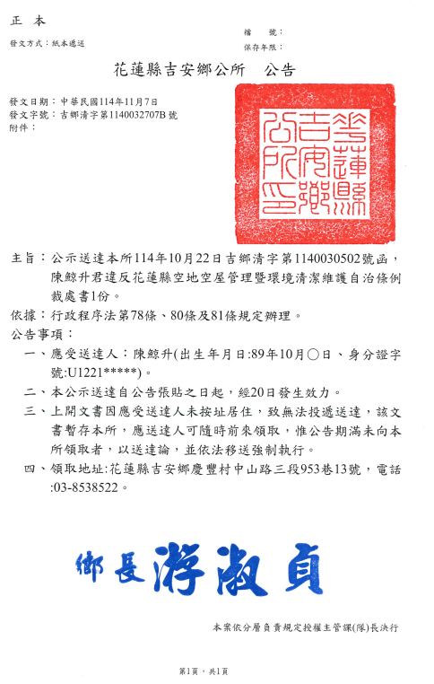 檢送花蓮縣吉安鄉公所辦理陳鯨升君違反花蓮縣空地空屋管理暨環境清潔維護自治條例裁處書一案,茲因其未按址居住或遷移不明,致行政文書無法送達,爰依行政程序法規定辦理公示送達公告