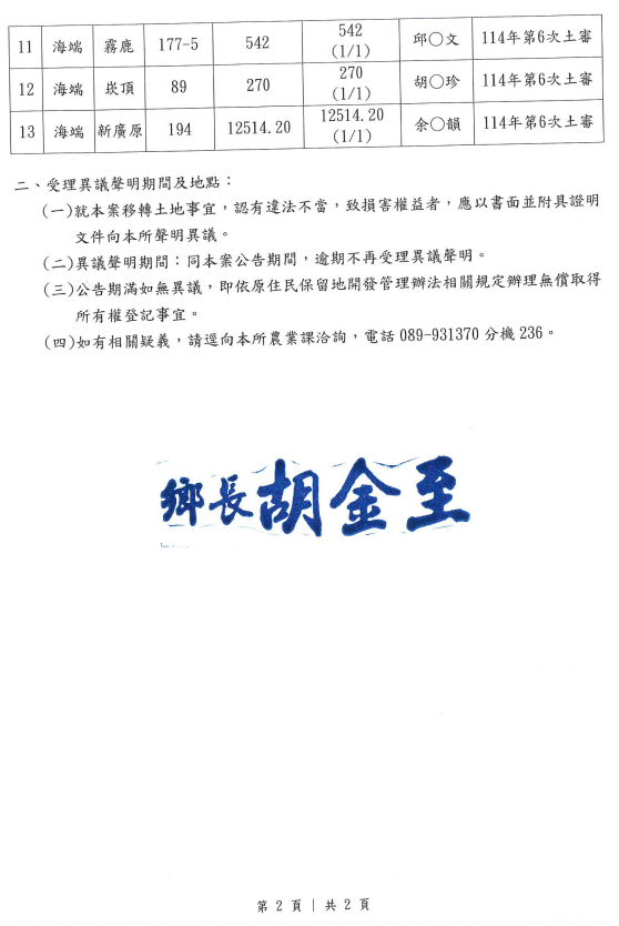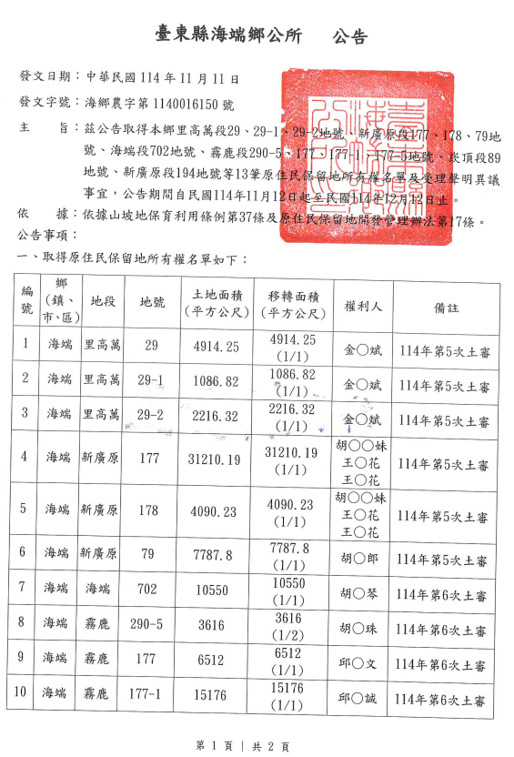 檢送臺東縣海端鄉公所勘誤本所114年11月7日海鄉農字第1140015879號(諒達)主旨,「公告期間自民國114年11月10日起至114年12月10日止」係誤植,更正為「公告期間自民國114年11月12日起至民國114年12月12日止」 上一篇 下一篇