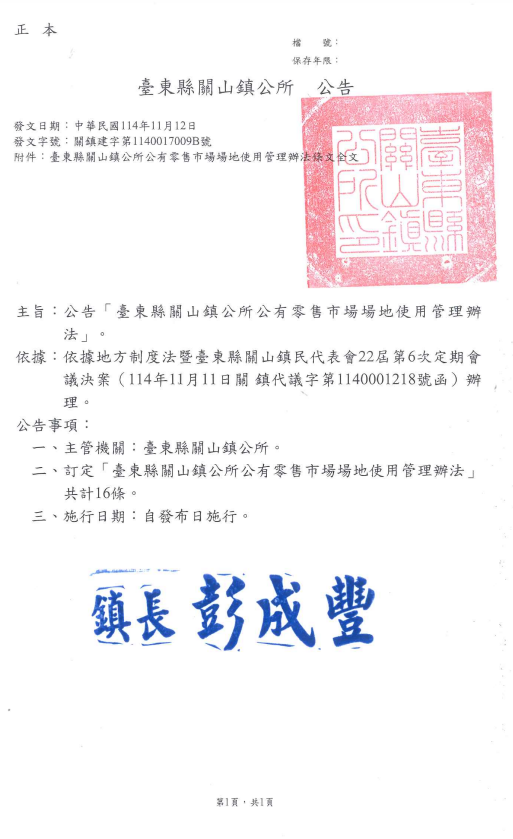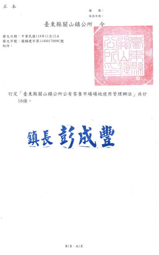 檢陳「臺東縣關山鎮公所公有零售市場場地使用管理辦法」全條文公告、令、條文總說明各1份 Attachments: 376545300A_1140017009_ATTACH1.pdf[ ]207 kB 376545300A_1140017009_ATTACH2.pdf[ ]55 kB 376545300A_1140017009_ATTACH3.pdf[ ]128 kB 上一篇 下一篇
