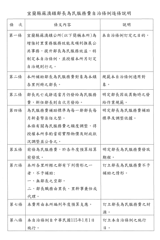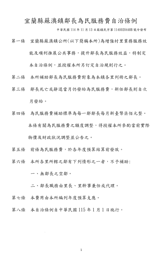 檢送宜蘭縣蘇澳鎮公所「宜蘭縣蘇澳鎮鄰長為民服務費自治條例」公告、發布令、條文及總說明各1份