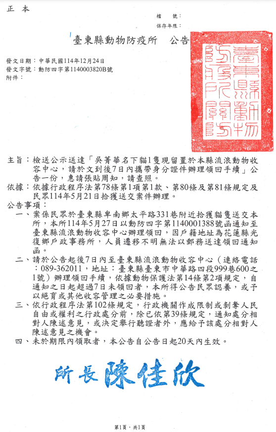 檢送臺東縣動物防疫所公示送達「吳菁華名下貓1隻現留置於本縣流浪動物收容中心,請於文到後7日內攜帶身分證件辦理領回手續」公告一份