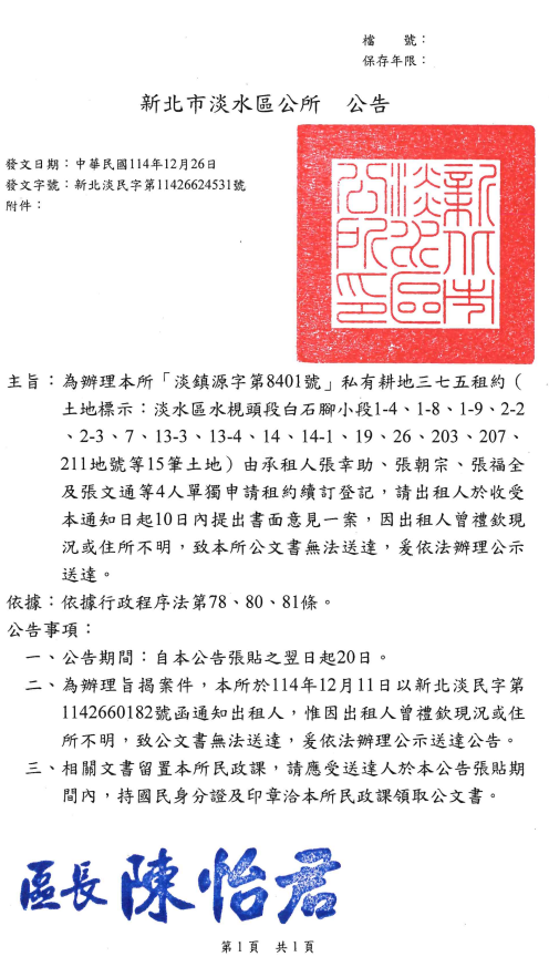 檢送新北市淡水區公所辦理本所「淡鎮源字第8401號」私有耕地三七五租約(土地標示:淡水區水梘頭段白石腳小段1-4、1-8、1-9、2-2、2-3、7、13-3、13-4、14、14-1、19、26、203、207、211地號等15筆土地)由承租人張幸助、張朝宗、張福全及張文通等4人單獨申請租約續訂登記,請出租人於收受本通知日起10日內提 上一篇 下一篇