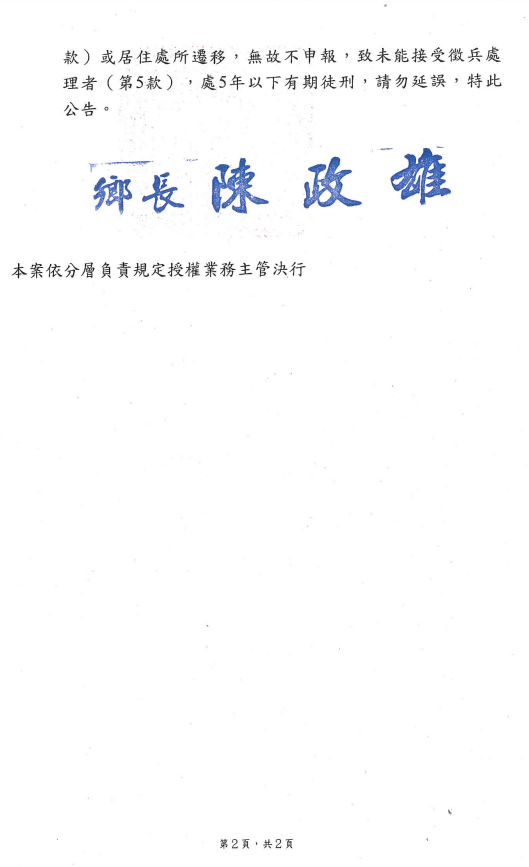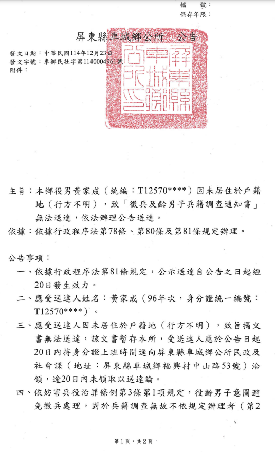 檢送屏東縣車城鄉公所本鄉96年次役男黃家成(統編:T125709529)兵籍調查通知書公示送達公告1份