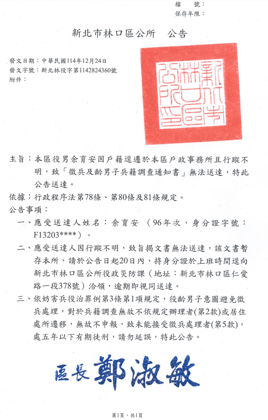 檢送新北市林口區公所役男余育安兵籍調查通知書公示送達公告1份