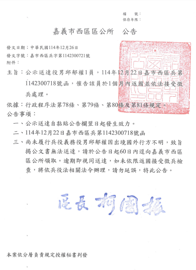 檢送嘉義市西區區公所本區役男邱郁權返國履行兵役義務催告函公示送達公告1份